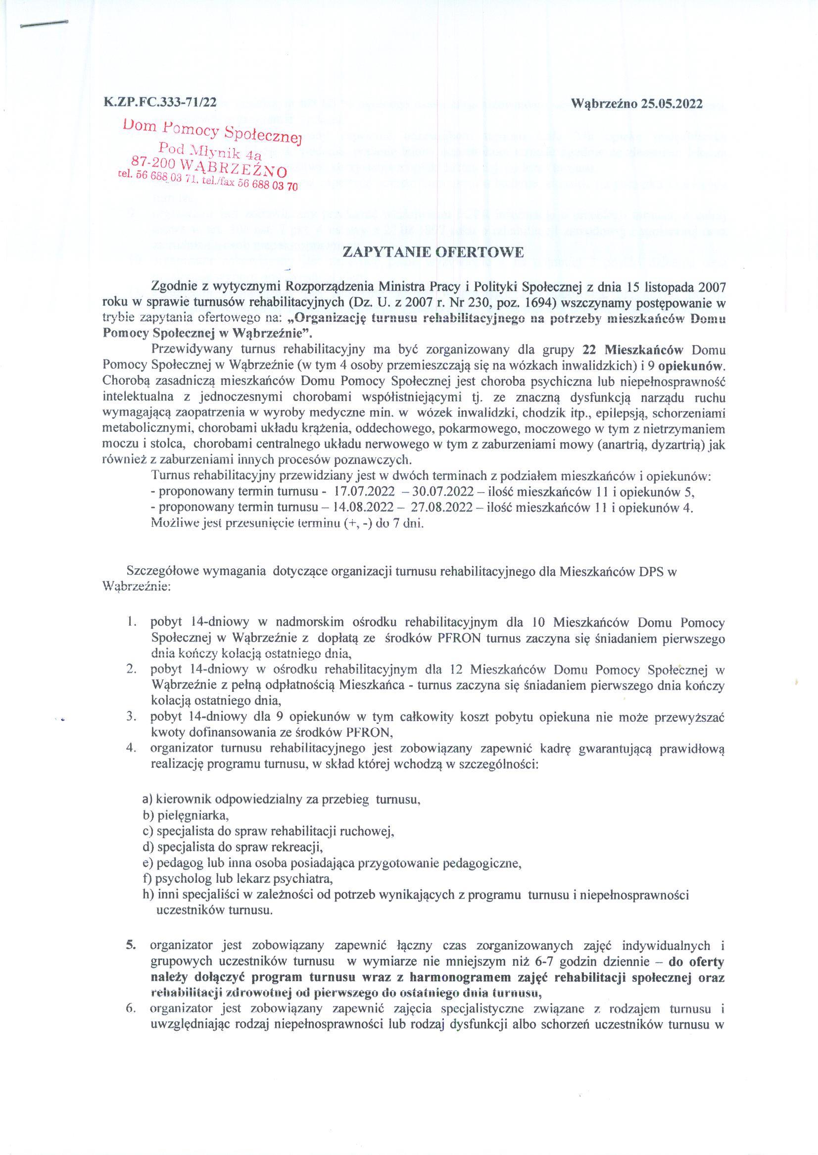 Zgodnie z wytycznymi Rozporządzenia Ministra Pracy i Polityki Społecznej z dnia 15 listopada 2007 roku w sprawie turnusów rehabilitacyjnych (Dz. U. z 2007 r. Nr 230, poz. 1694) wszczynamy postępowanie w trybie zapytania ofertowego na: „Organizację turnusu rehabilitacyjnego na potrzeby mieszkańców Domu Pomocy Społecznej w Wąbrzeźnie”.
