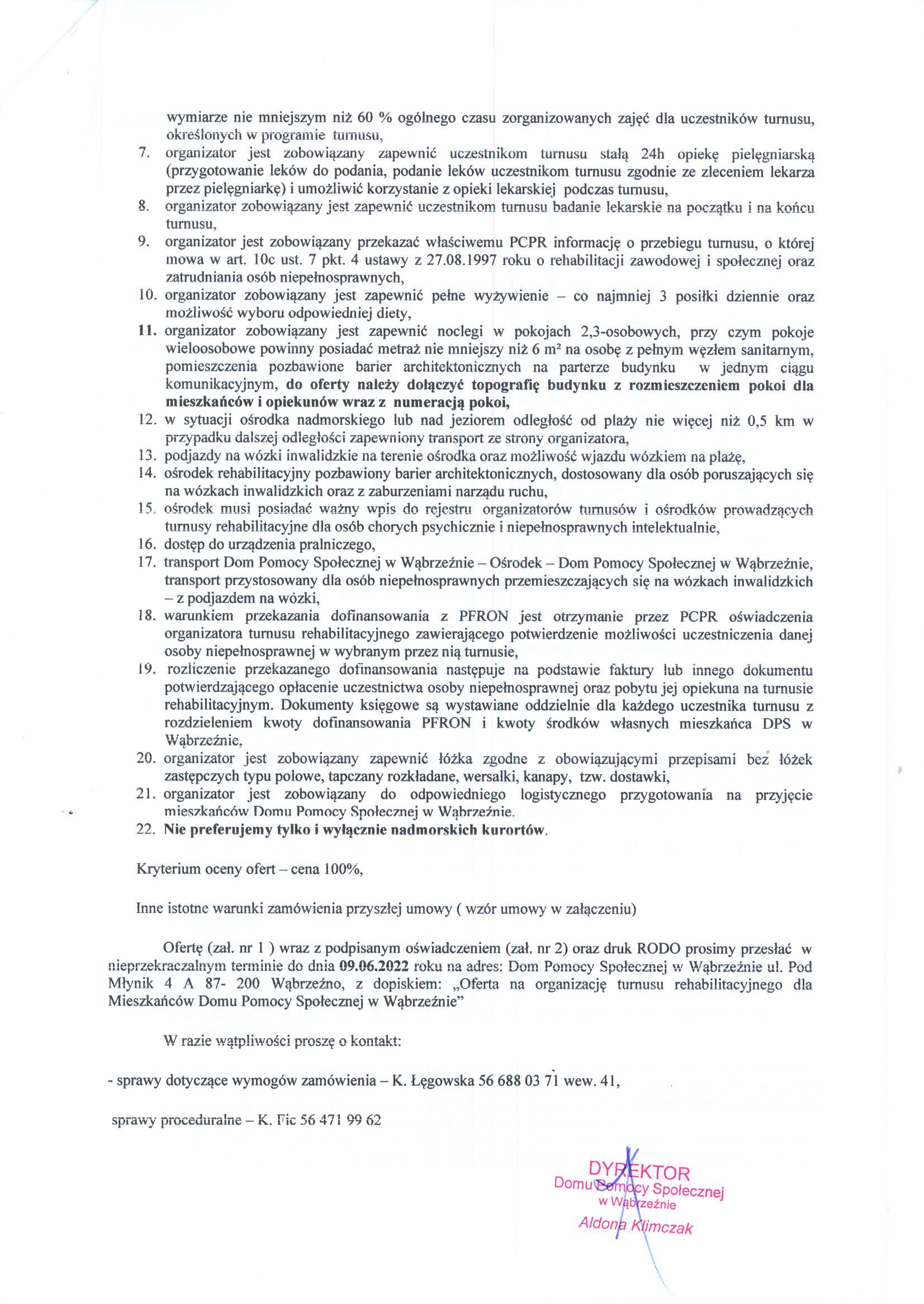 Ofertę (zał. nr 1 ) wraz z podpisanym oświadczeniem (zał. nr 2) oraz druk RODO prosimy przesłać w nieprzekraczalnym terminie do dnia 09.06.2022 roku na adres: Dom Pomocy Społecznej w Wąbrzeźnie ul. Pod Młynik 4 A 87- 200 Wąbrzeźno, z dopiskiem: „Oferta na organizację turnusu rehabilitacyjnego dla Mieszkańców Domu Pomocy Społecznej w Wąbrzeźnie”