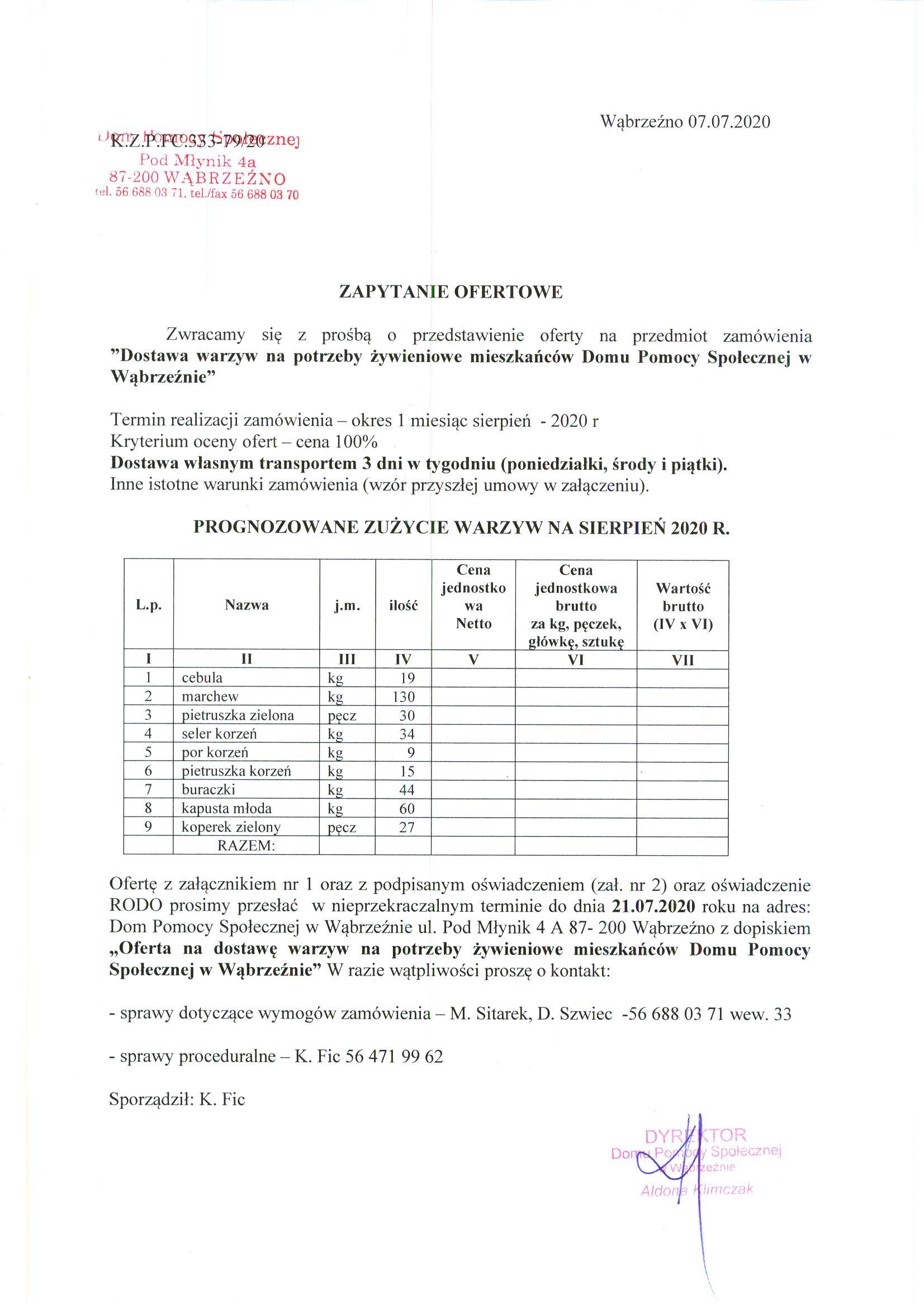 Zapytanie ofertowe na zakup i dostawę warzyw na potrzeby żywieniowe mieszkańców Domu Pomocy Społecznej w Wąbrzeźnie na miesiąc sierpień 2020 roku