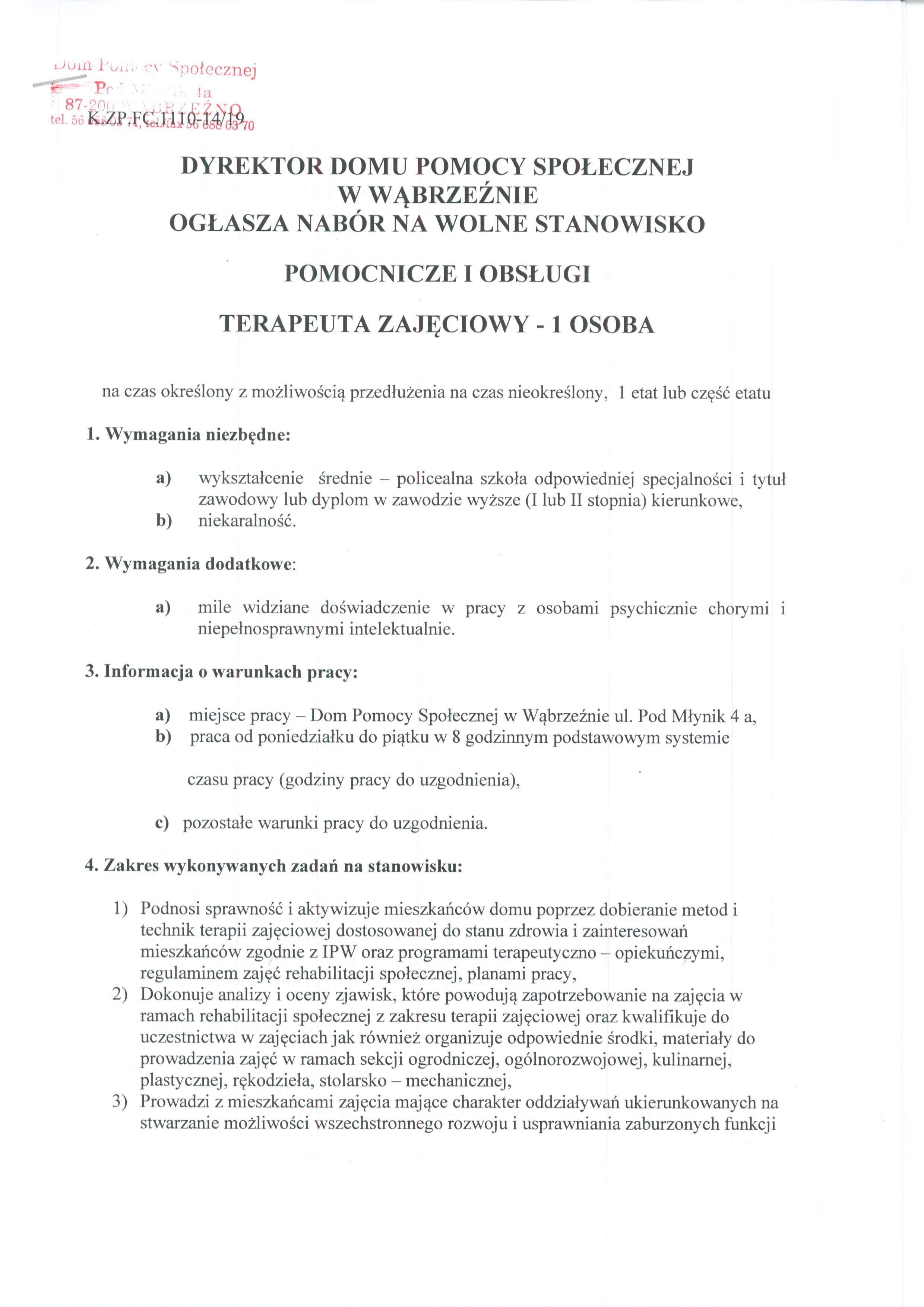 | utworzono: | data: 11:56, 16.09.2019 | przez: Redaktor DPS | Dyrektor Domu Pomocy Społecznej w Wąbrzeźnie ogłasza nabór na wolne stanowisko pomocnicze i obsługi terapeuta zajęciowy - 1 osoba |