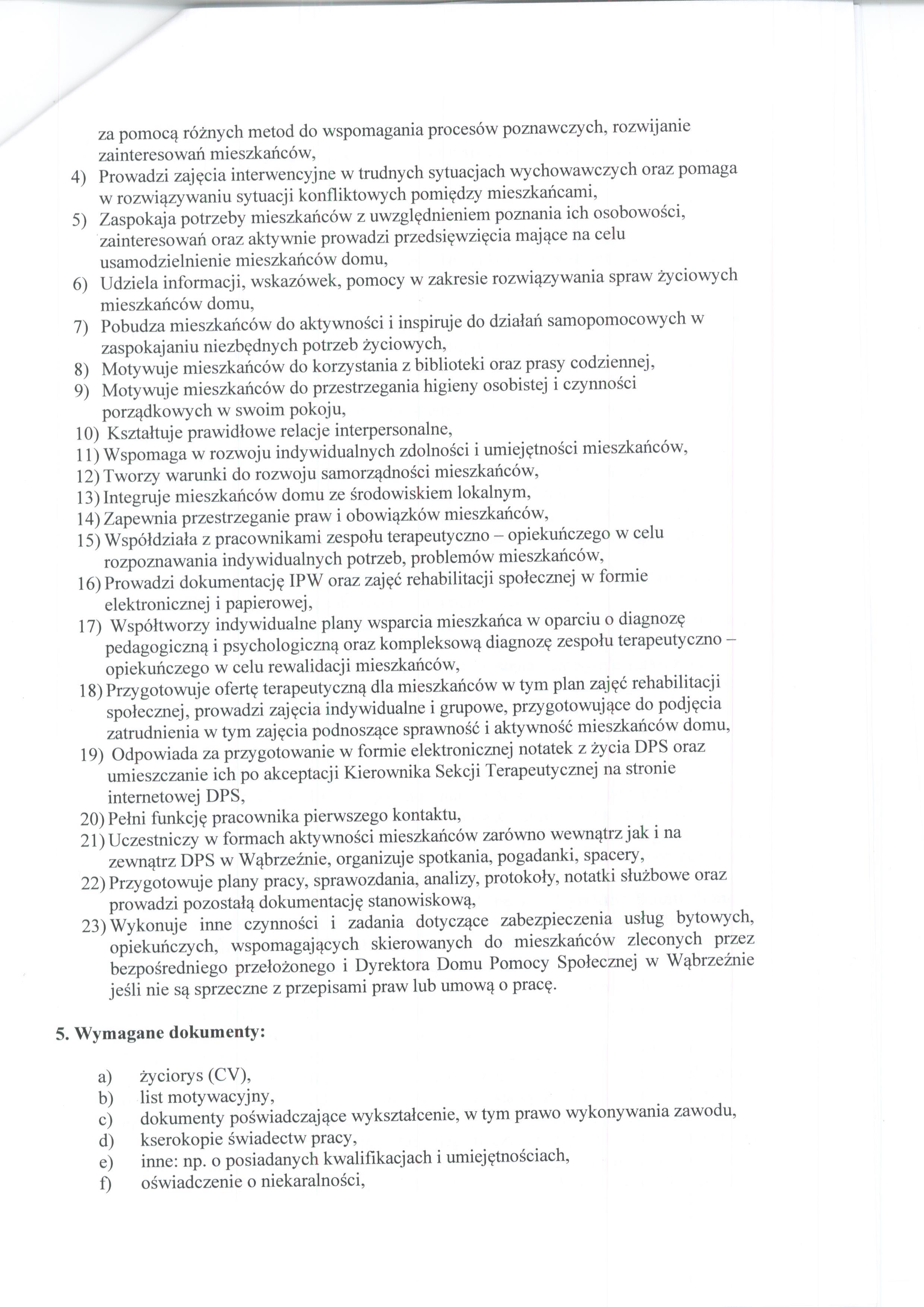 - Wykonuje inne czynności i zadania dotyczące zabezpieczenia usług bytowych, opiekuńczych, wspomagających skierowanych do mieszkańców zleconych przez bezpośredniego przełożonego i Dyrektora Domu Pomocy Społecznej w Wąbrzeźnie jeśli nie są sprzeczne z przepisami praw lub umową o pracę.
