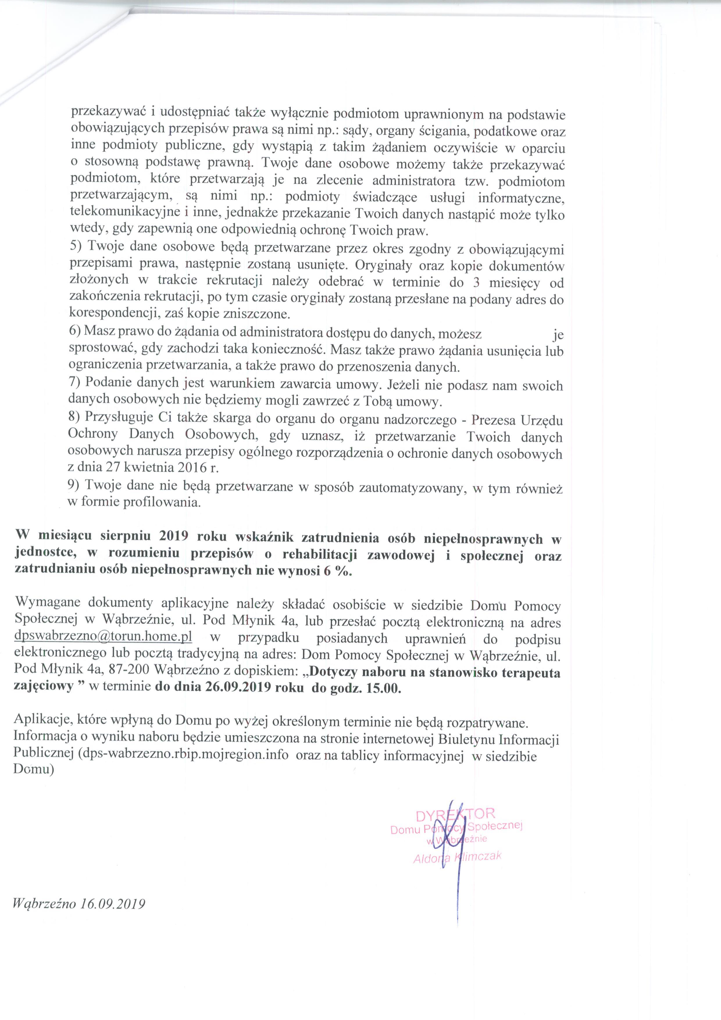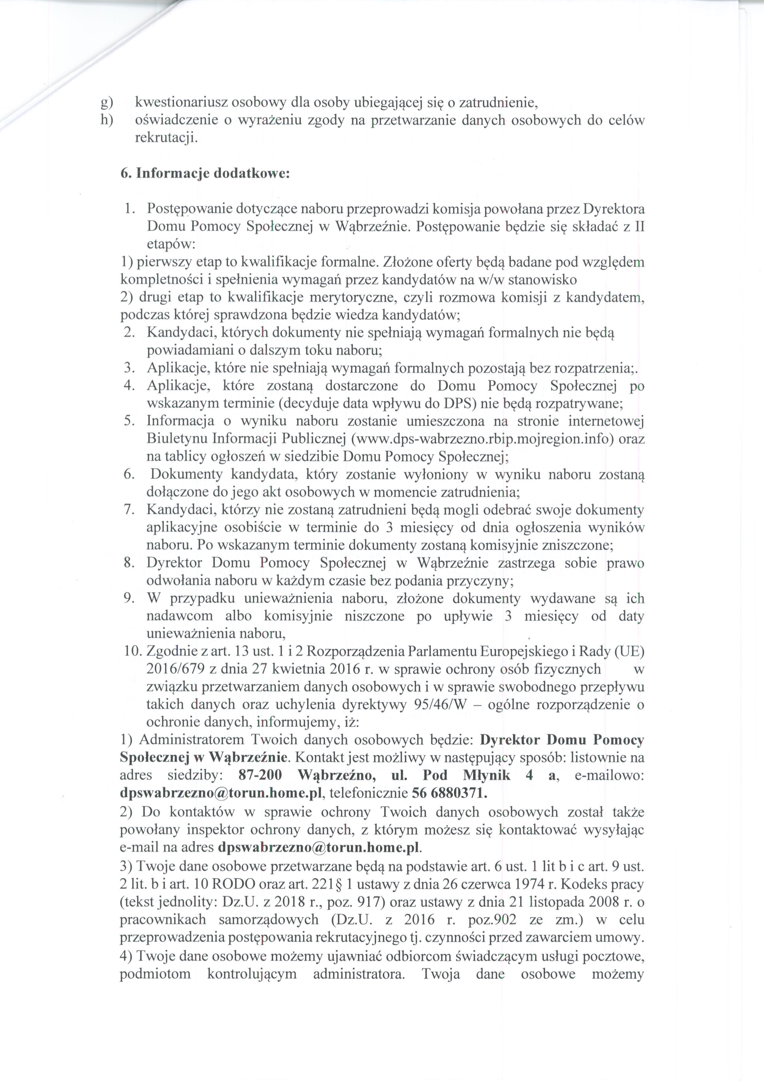 - Dyrektor Domu Pomocy Społecznej w Wąbrzeźnie zastrzega sobie prawo odwołania naboru w każdym czasie bez podania przyczyny;