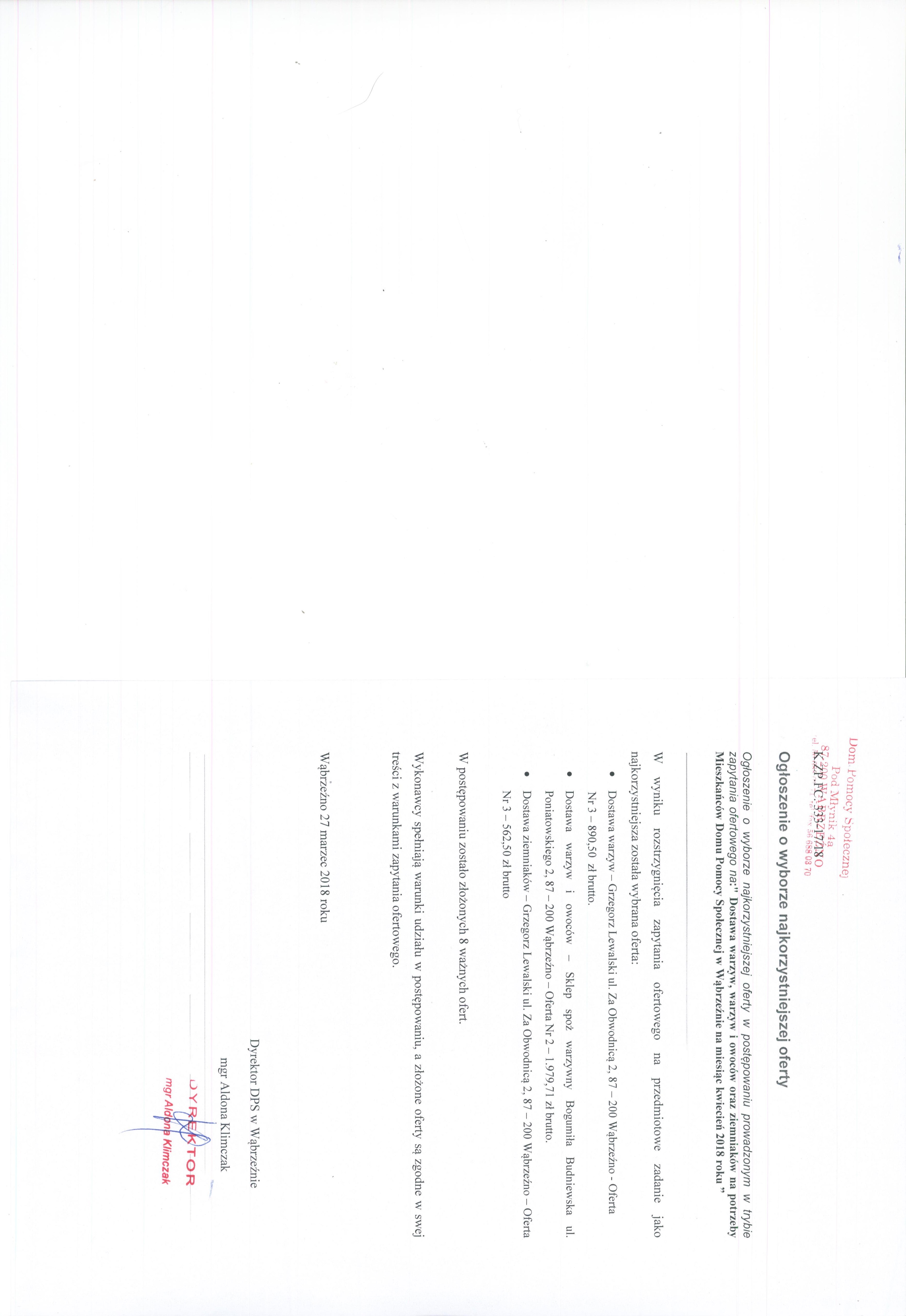 ” Dostawa warzyw, warzyw i owoców oraz ziemniaków na potrzeby Mieszkańców Domu Pomocy Społecznej w Wąbrzeźnie na miesiąc kwiecień 2018 roku ”