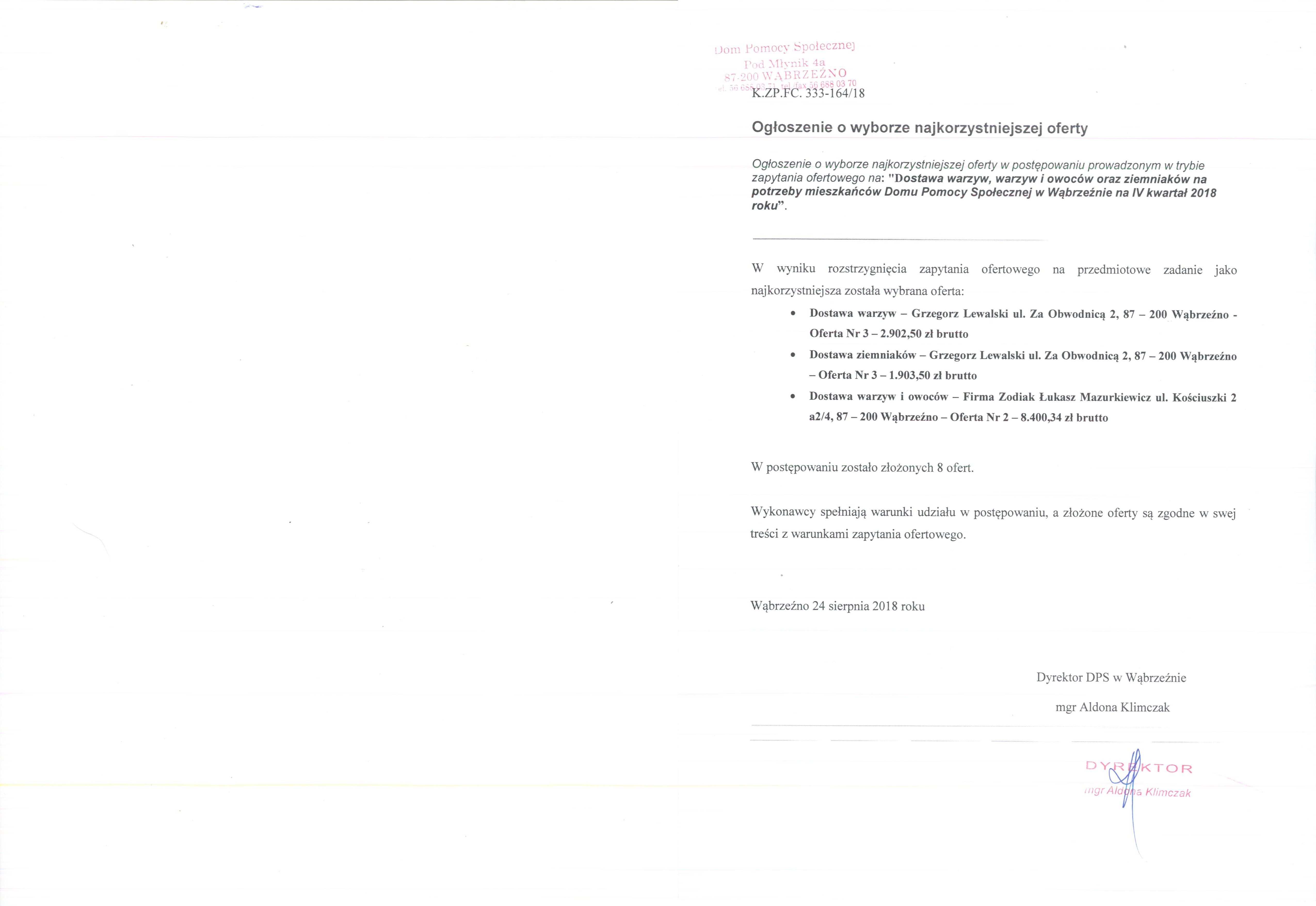 Wąbrzeźno 24 sierpnia 2018 roku Dyrektor DPS w Wąbrzeźnie mgr Aldona Klimczak |