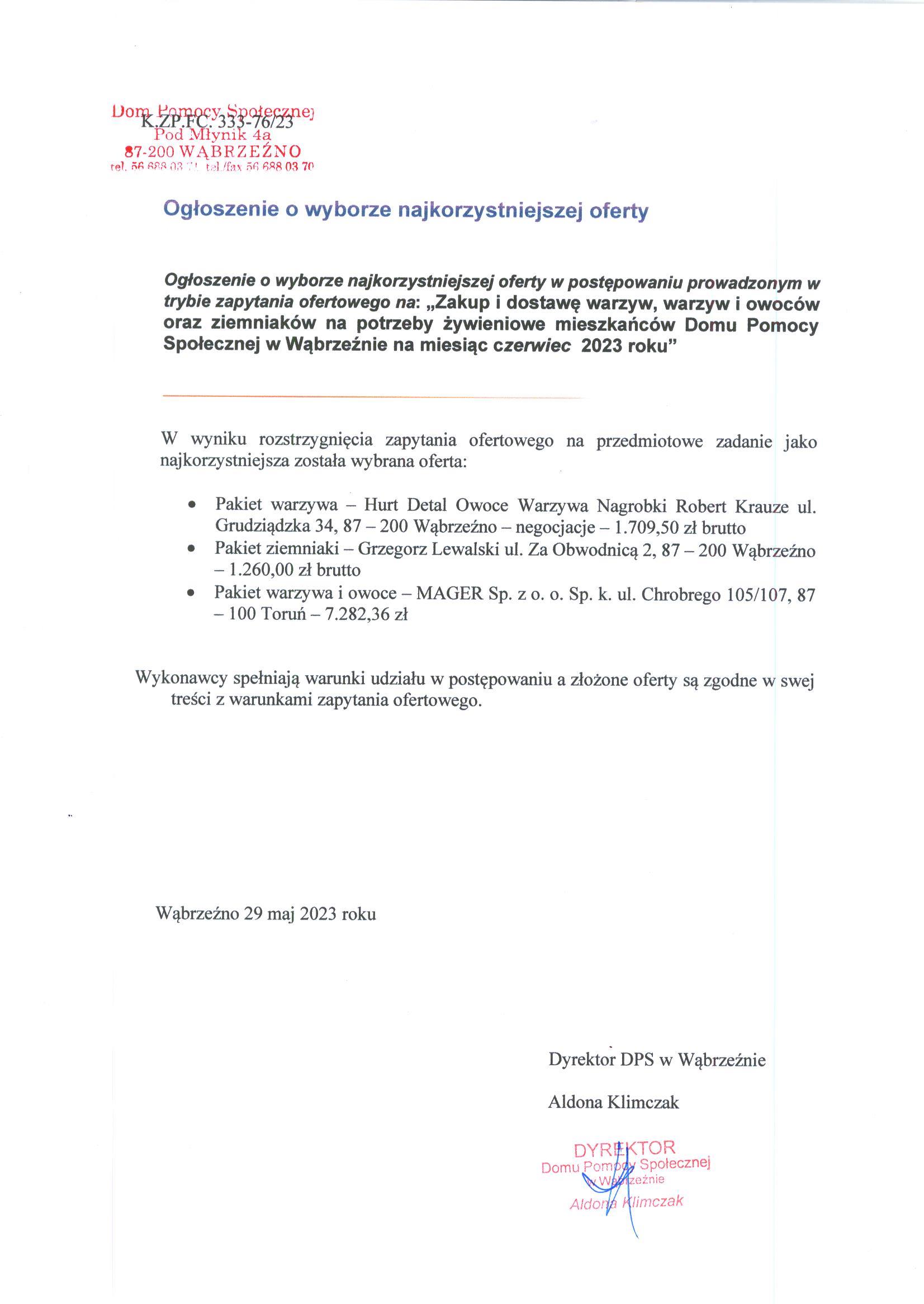 „Zakup i dostawę warzyw, warzyw i owoców oraz ziemniaków na potrzeby żywieniowe mieszkańców Domu Pomocy Społecznej w Wąbrzeźnie na miesiąc czerwiec 2023 roku”