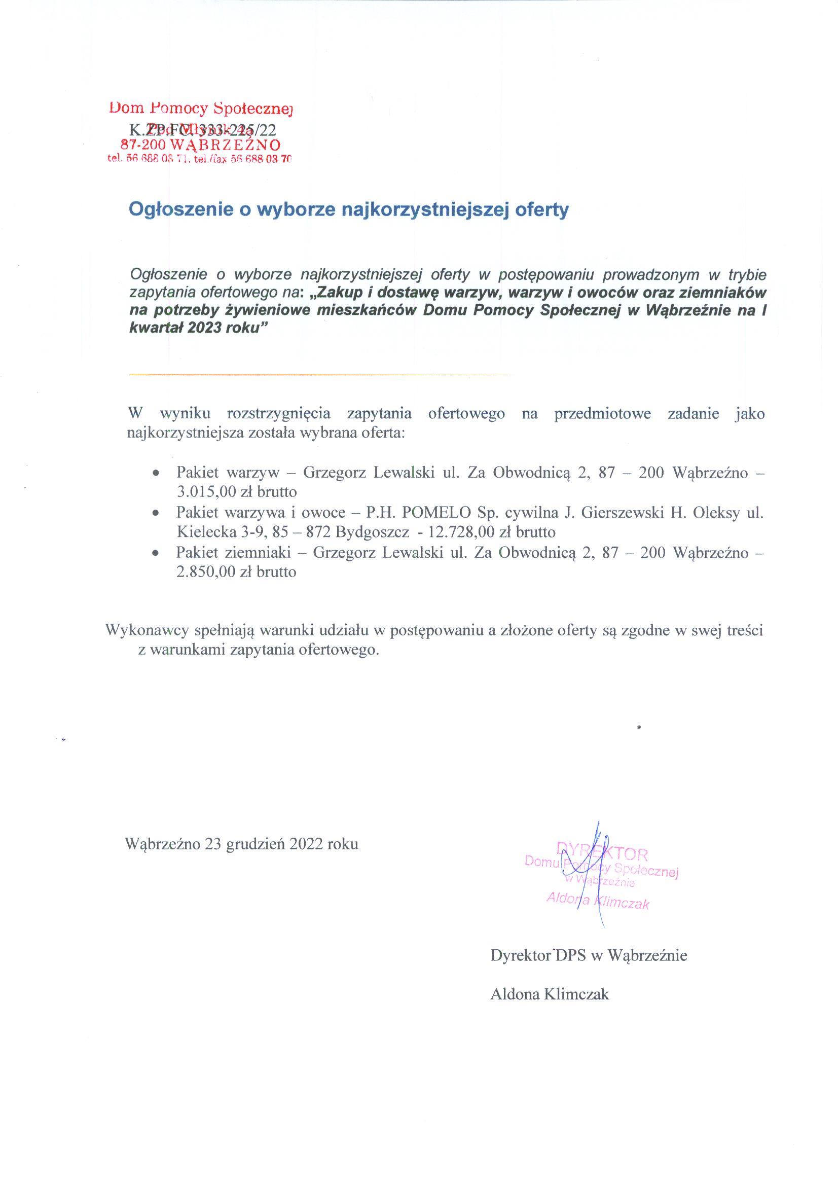 „Zakup i dostawę warzyw, warzyw i owoców oraz ziemniaków na potrzeby żywieniowe mieszkańców Domu Pomocy Społecznej w Wąbrzeźnie na I kwartał 2023 roku”