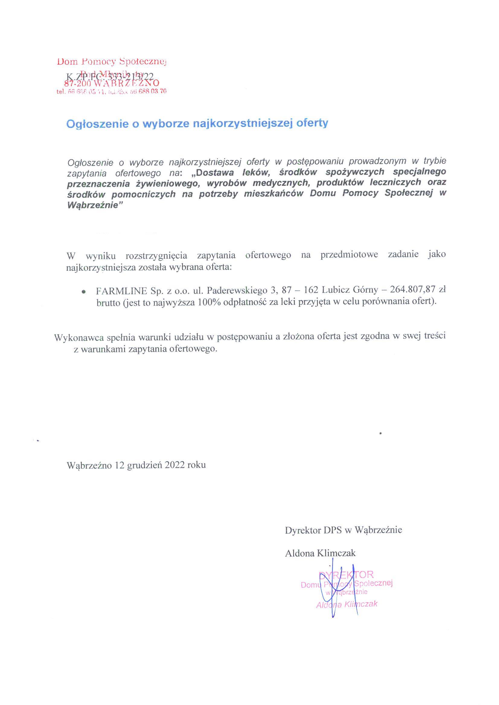 Informacja o wyborze najkorzystniejszej oferty w postępowaniu prowadzonym w trybie ofertowym na:” Dostawę leków, środków spożywczych specjalnego przeznaczenia żywieniowego, wyrobów medycznych, produktów leczniczych oraz środków pomocniczych na potrzeby mieszkańców Domu Pomocy Społecznej w Wąbrzeźnie”