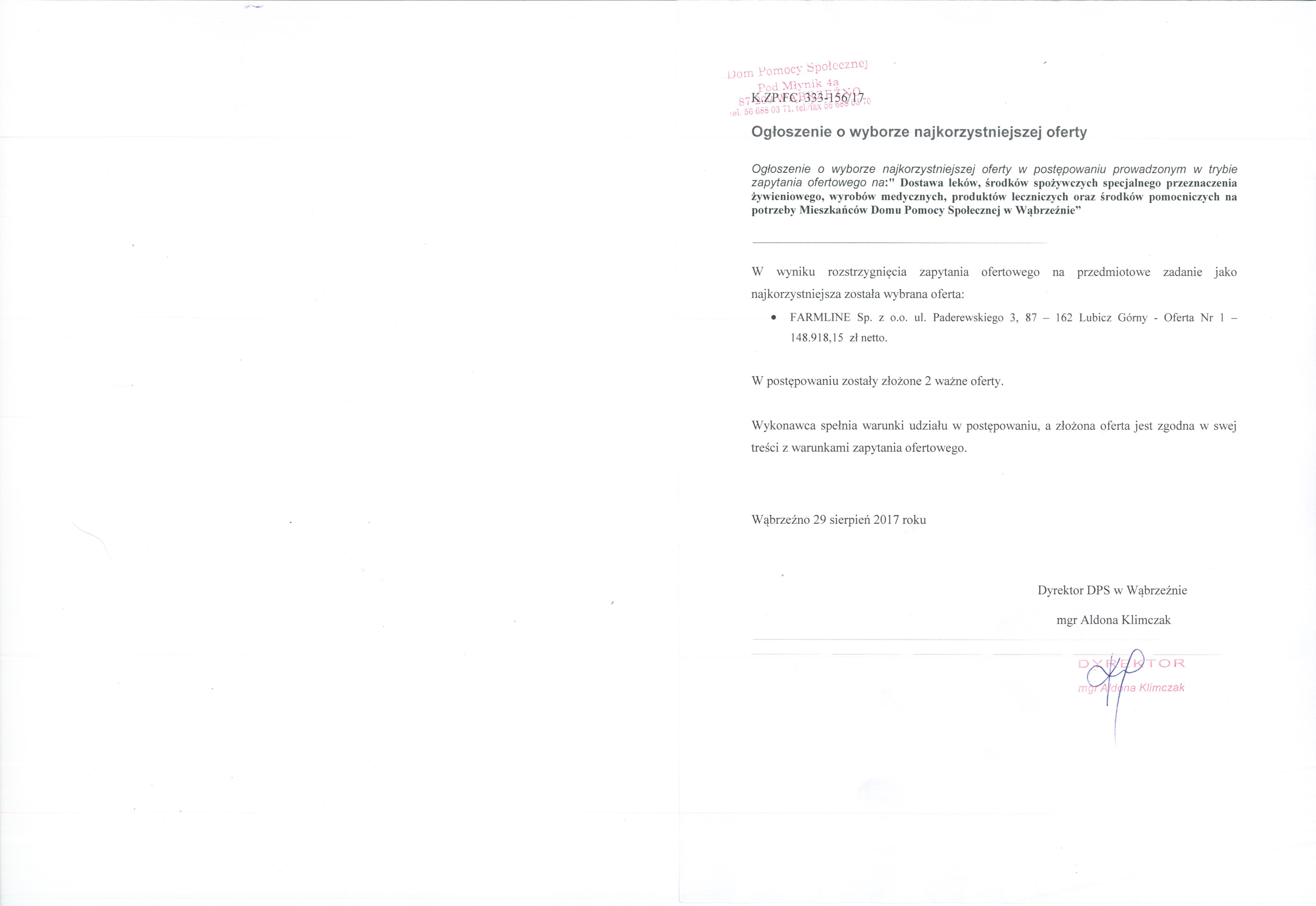 W postępowaniu zostały złożone 2 ważne oferty. Wykonawca spełnia warunki udziału w postępowaniu, a złożona oferta jest zgodna w swej treści z warunkami zapytania ofertowego. Wąbrzeźno 29 sierpień 2017 roku