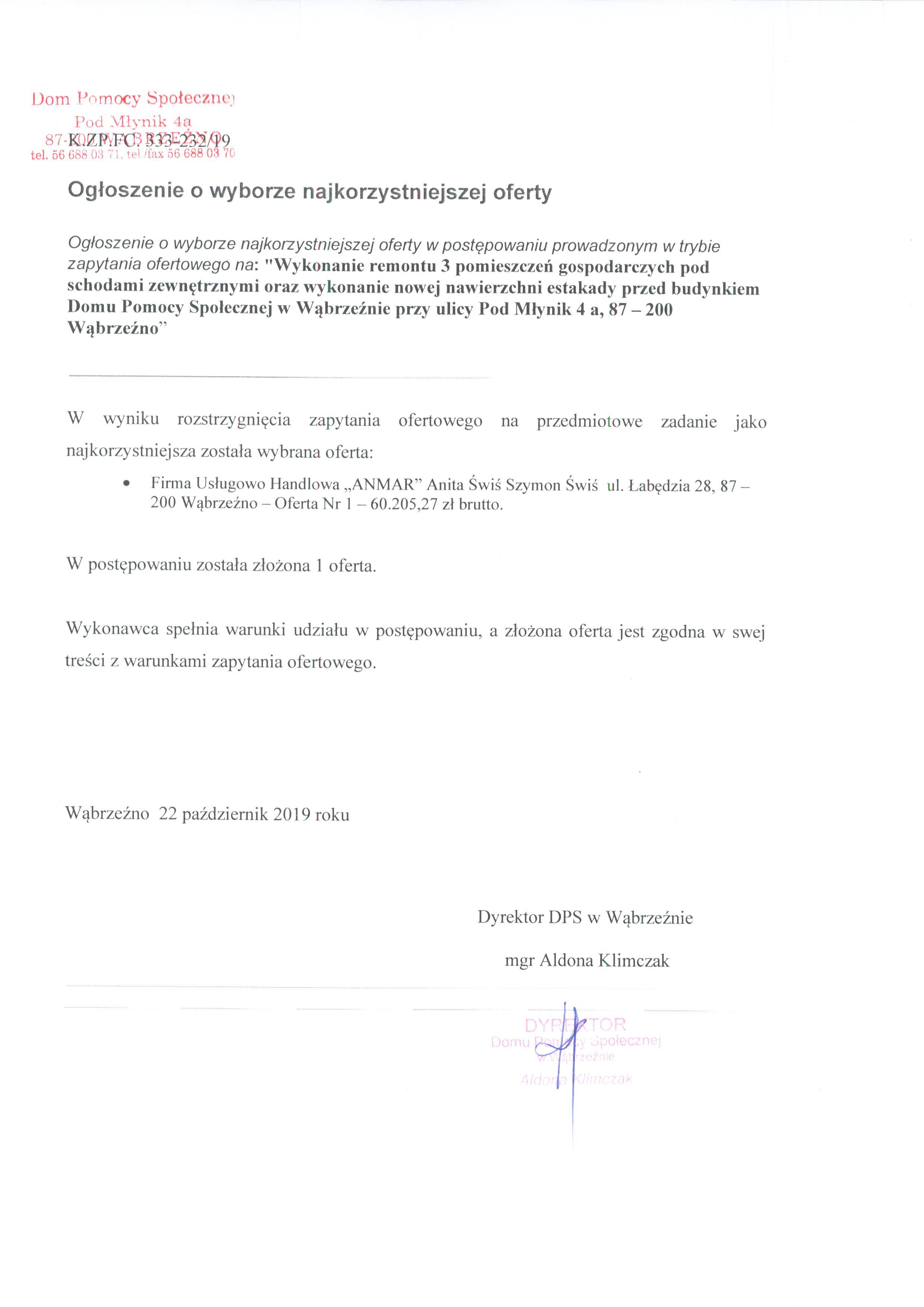 Firma Usługowo Handlowa „ANMAR” Anita Świś Szymon Świś ul. Łabędzia 28, 87 – 200 Wąbrzeźno – Oferta Nr 1 – 60.205,27 zł brutto. W postępowaniu została złożona 1 oferta.