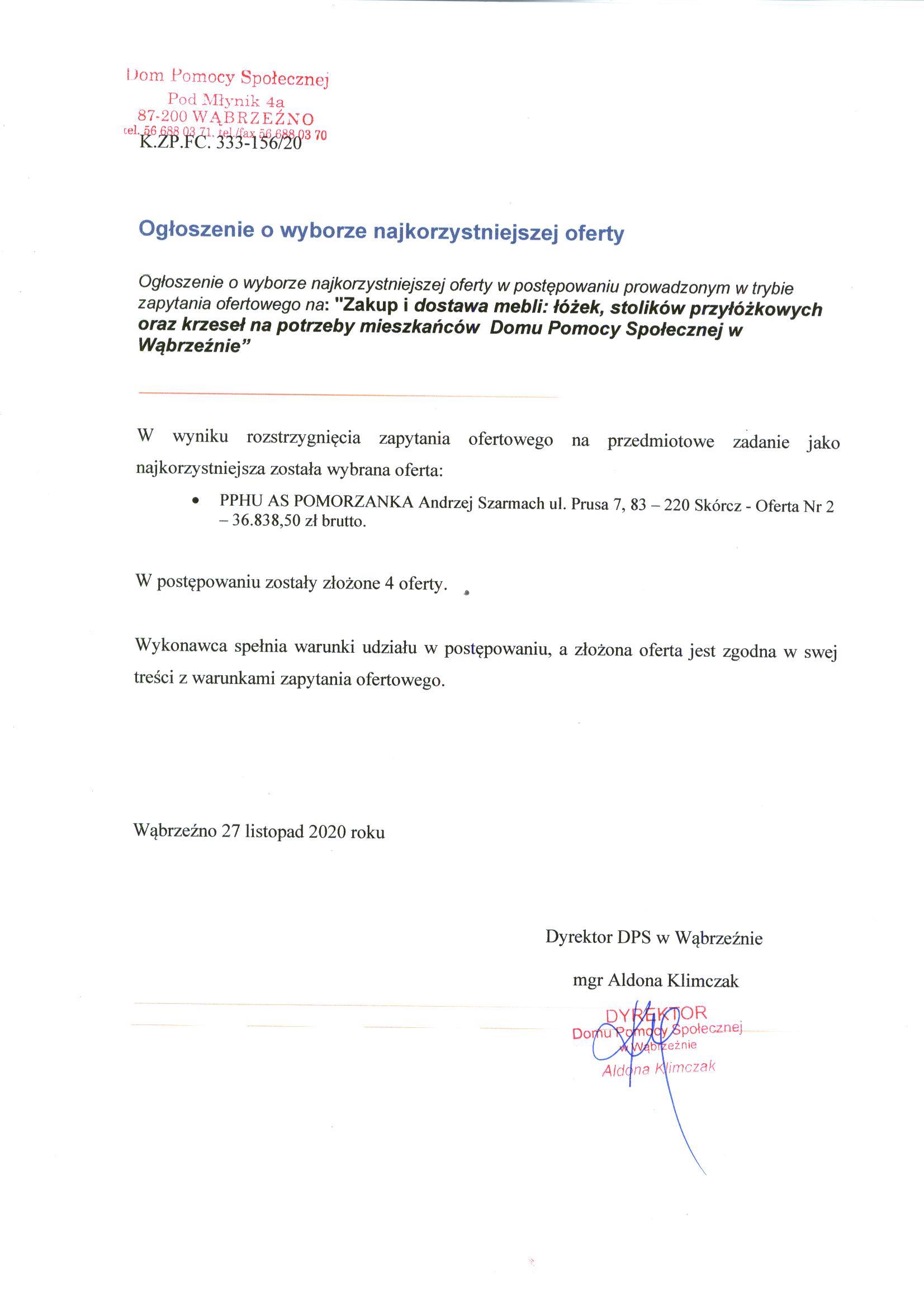 Wąbrzeźno 27 listopad 2020 Dyrektor DPS w Wąbrzeźnie mgr Aldona Klimczak |