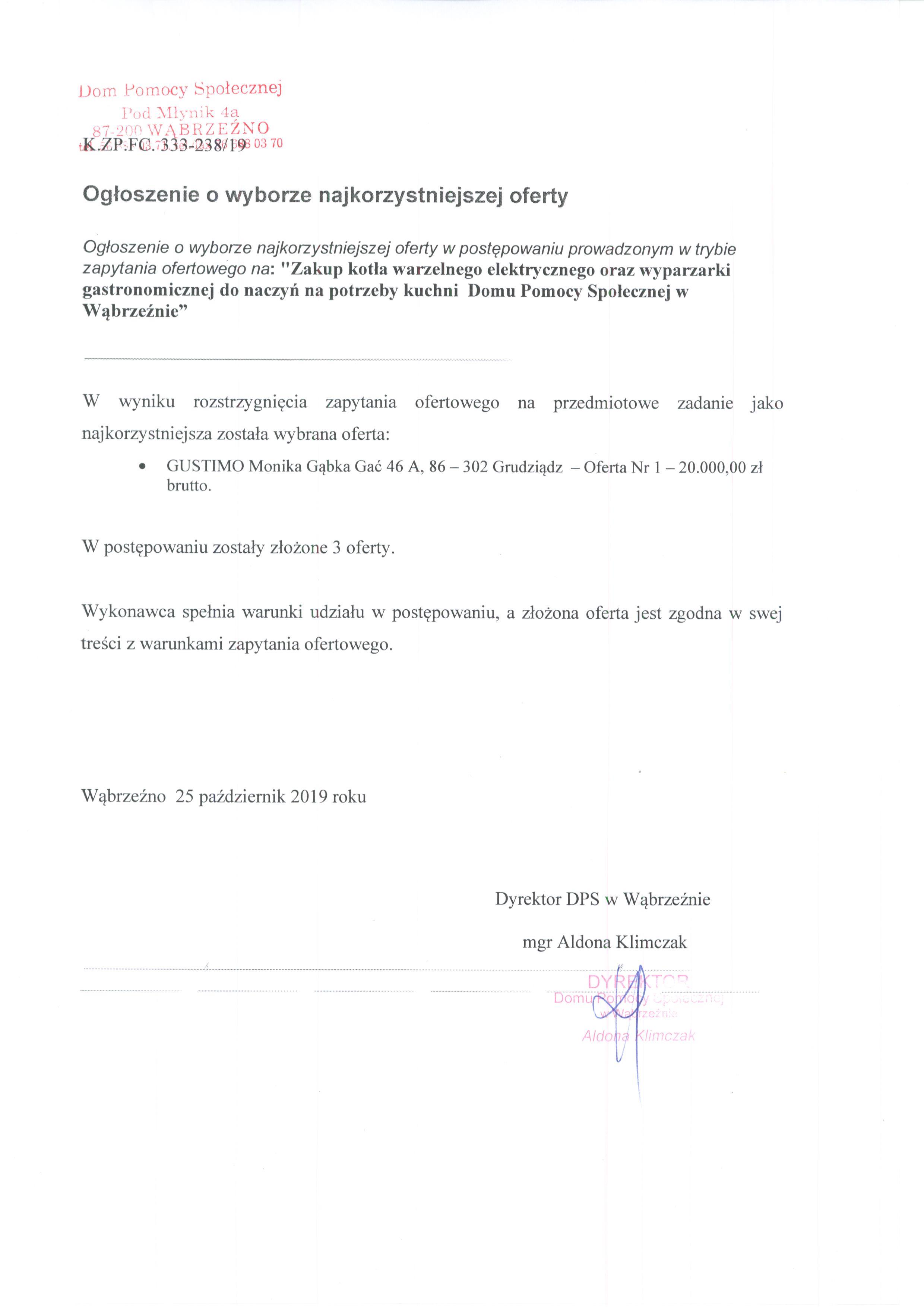 „Zakup kotła warzelnego elektrycznego oraz wyparzarki gastronomicznej do naczyń na potrzeby kuchni Domu Pomocy Społecznej w Wąbrzeźnie” |