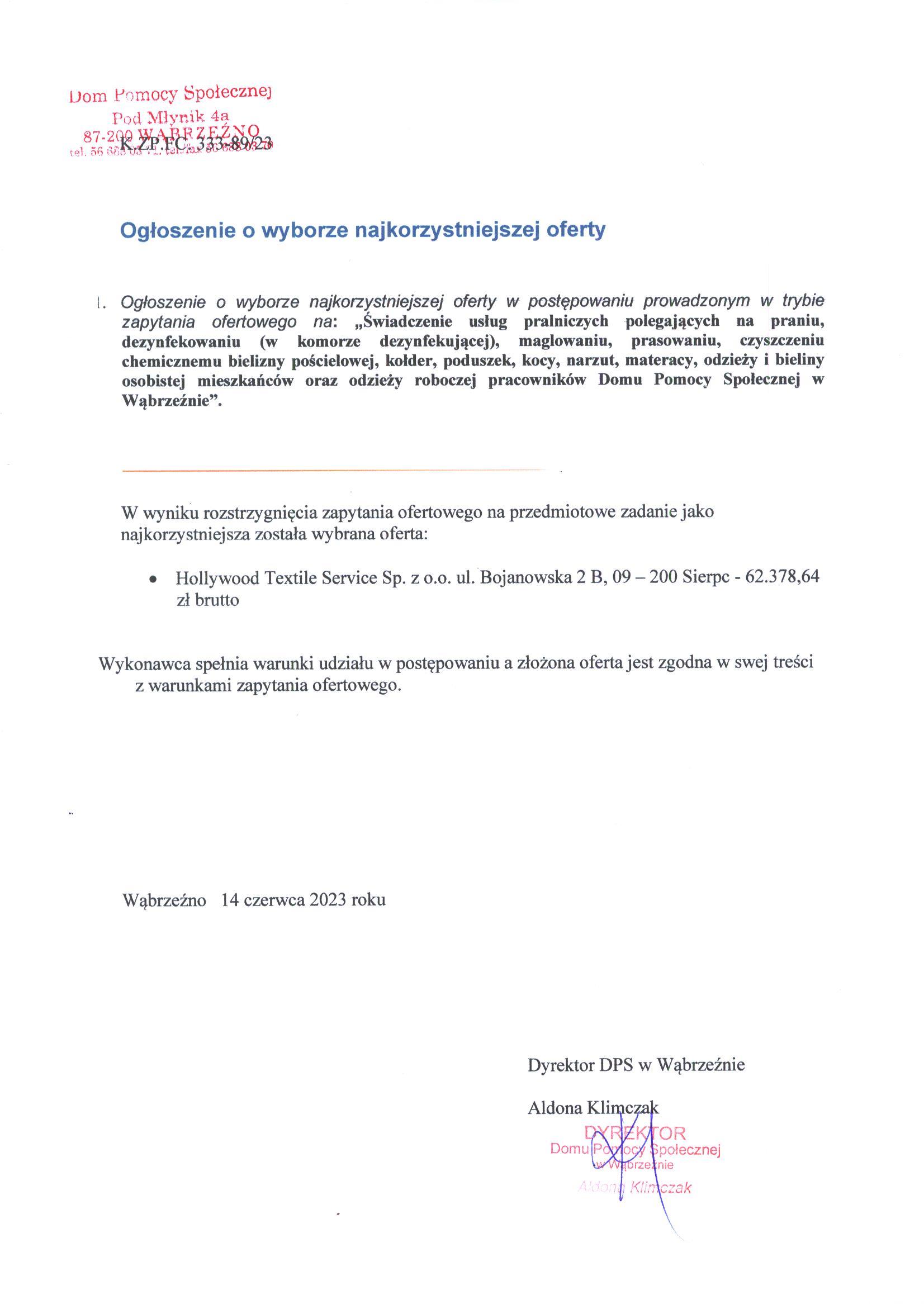 „Świadczenie usług pralniczych polegających na praniu, dezynfekowaniu (w komorze dezynfekującej), maglowaniu, prasowaniu, czyszczeniu chemicznemu bielizny pościelowej, kołder, poduszek, kocy, narzut, materacy, odzieży i bielizny osobistej mieszkańców oraz odzieży roboczej pracowników Domu Pomocy Społecznej w Wąbrzeźnie”.