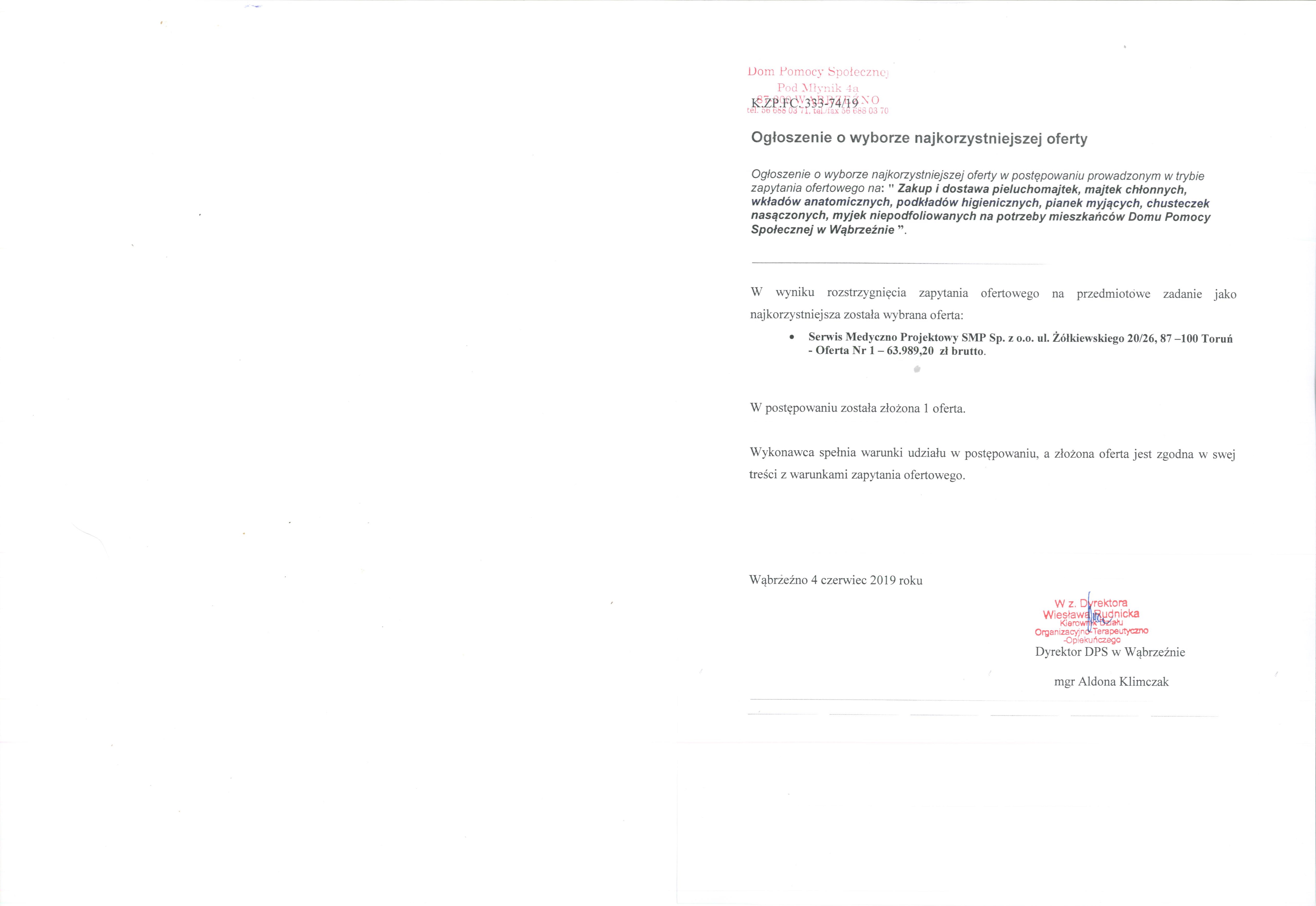 | W wyniku rozstrzygnięcia zapytania ofertowego na przedmiotowe zadanie jako najkorzystniejsza została wybrana oferta: