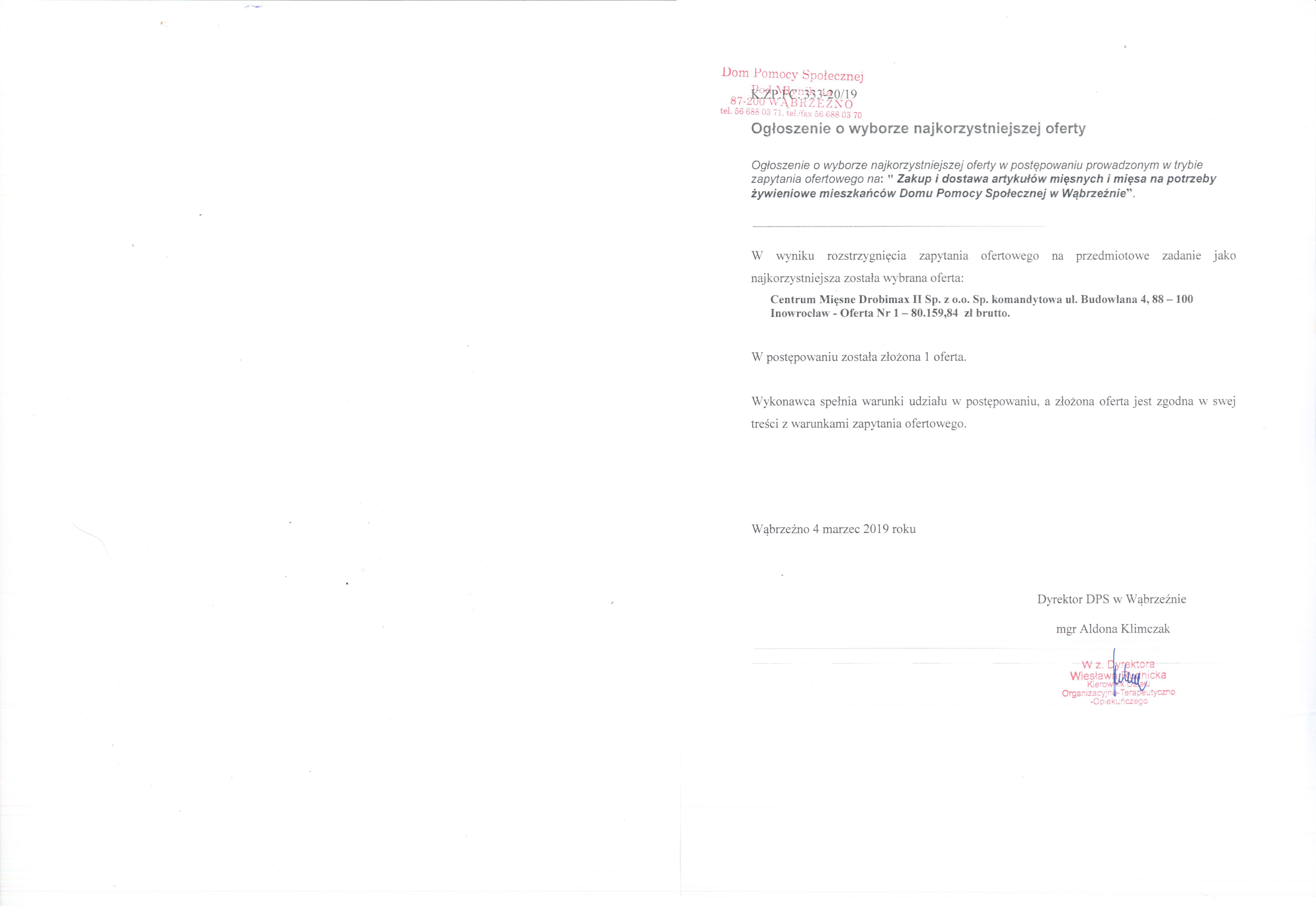 Centrum Mięsne Drobimax II Sp. z o.o. Sp. komandytowa ul. Budowlana 4, 88 – 100 Inowrocław – Oferta Nr 1 – 80.159,84 zł brutto. W postępowaniu została złożona 1 oferta.