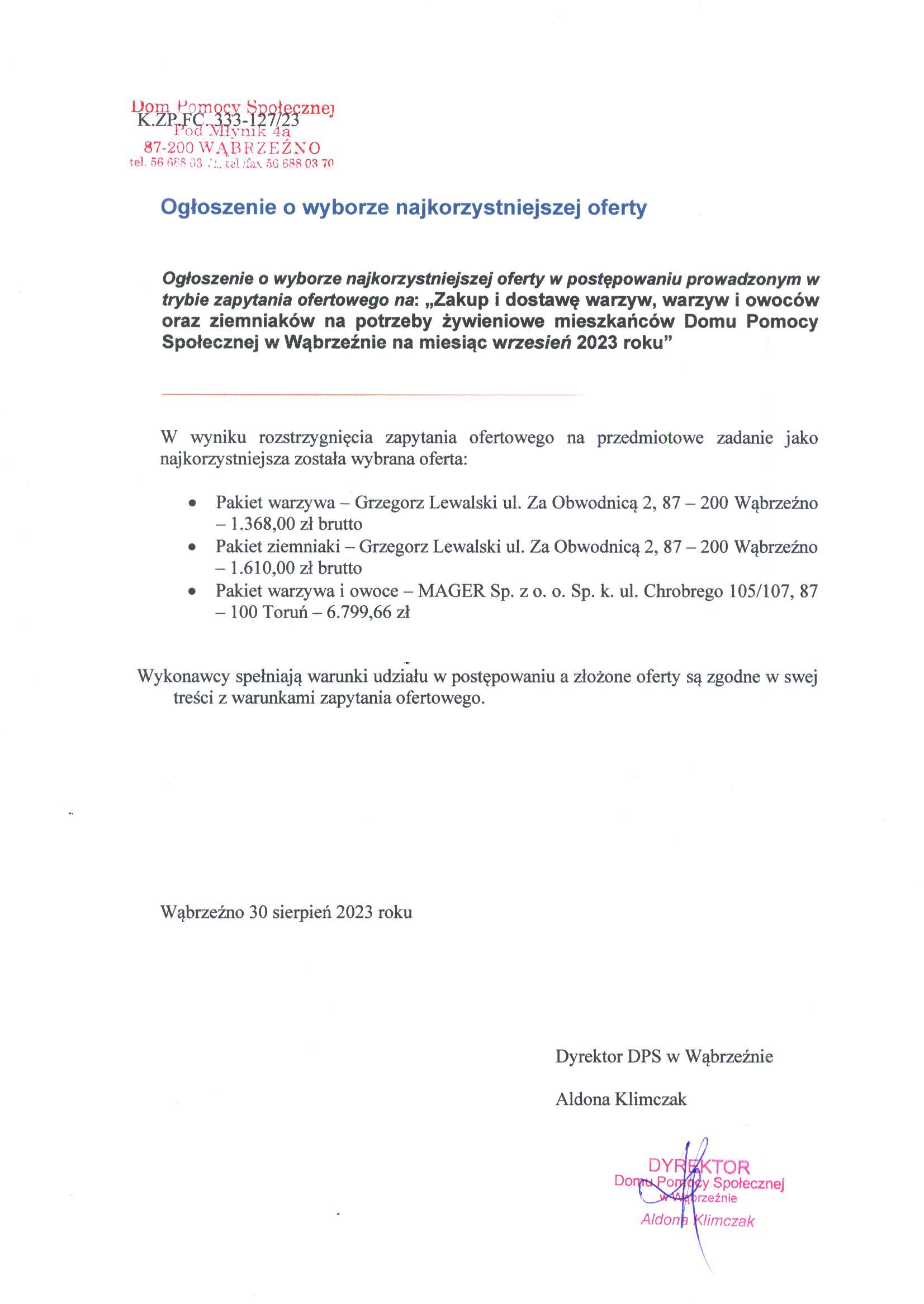 „Zakup i dostawę warzyw, warzyw i owoców oraz ziemniaków na potrzeby żywieniowe mieszkańców Domu Pomocy Społecznej w Wąbrzeźnie na miesiąc wrzesień 2023 roku”