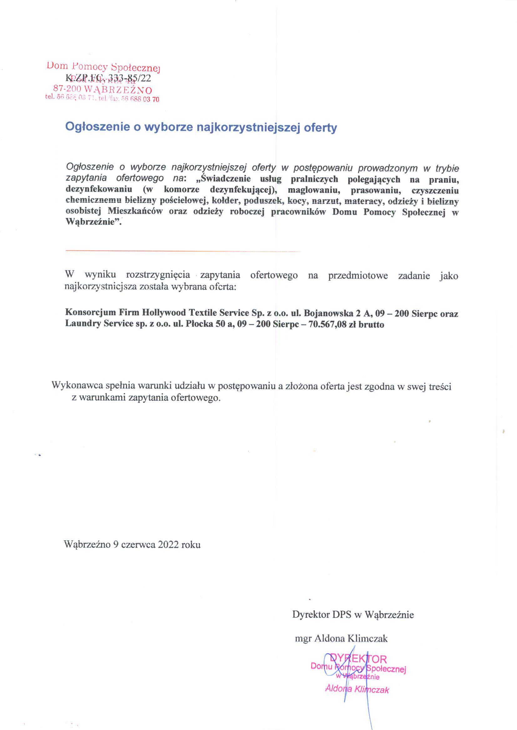 „Świadczenie usług pralniczych polegających na praniu, dezynfekowaniu (w komorze dezynfekującej), maglowaniu, prasowaniu, czyszczeniu chemicznemu bielizny pościelowej, kołder, poduszek, kocy, narzut, materacy, odzieży i bielizny osobistej Mieszkańców oraz odzieży roboczej pracowników Domu Pomocy Społecznej w Wąbrzeźnie”.
