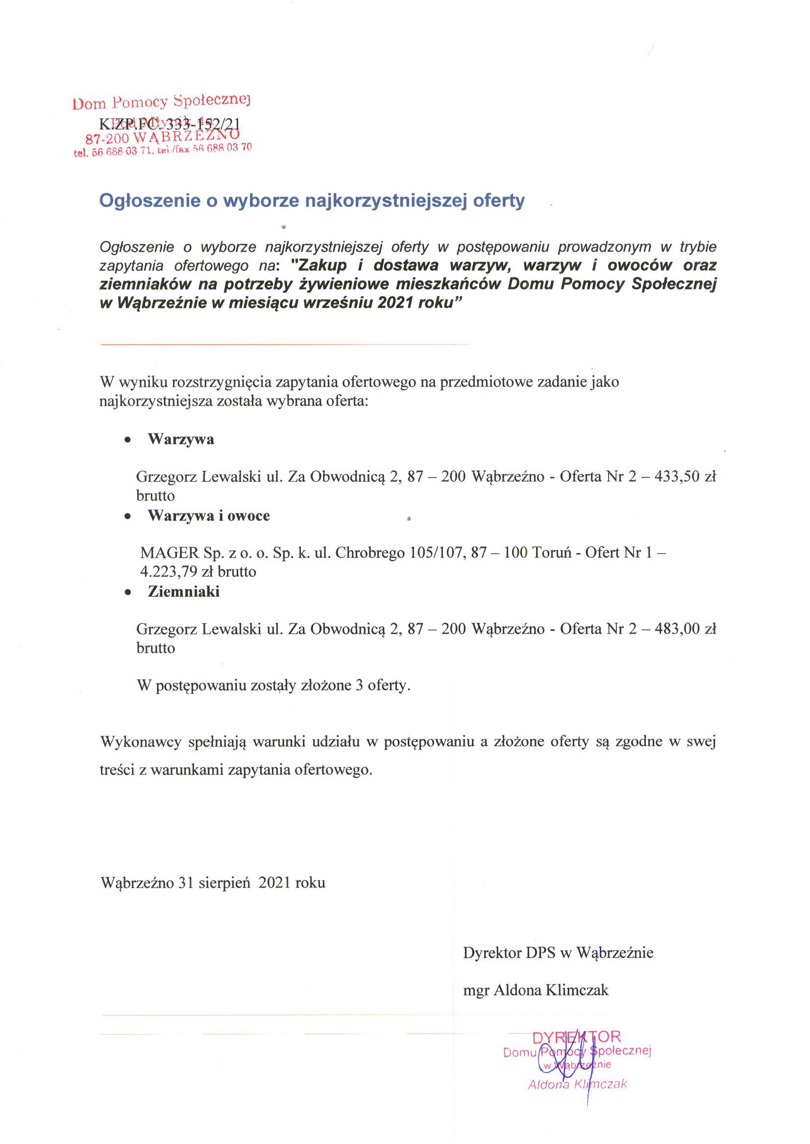 Wąbrzeźno 31 sierpień 2021 roku Dyrektor DPS w Wąbrzeźnie mgr Aldona Klimczak |
