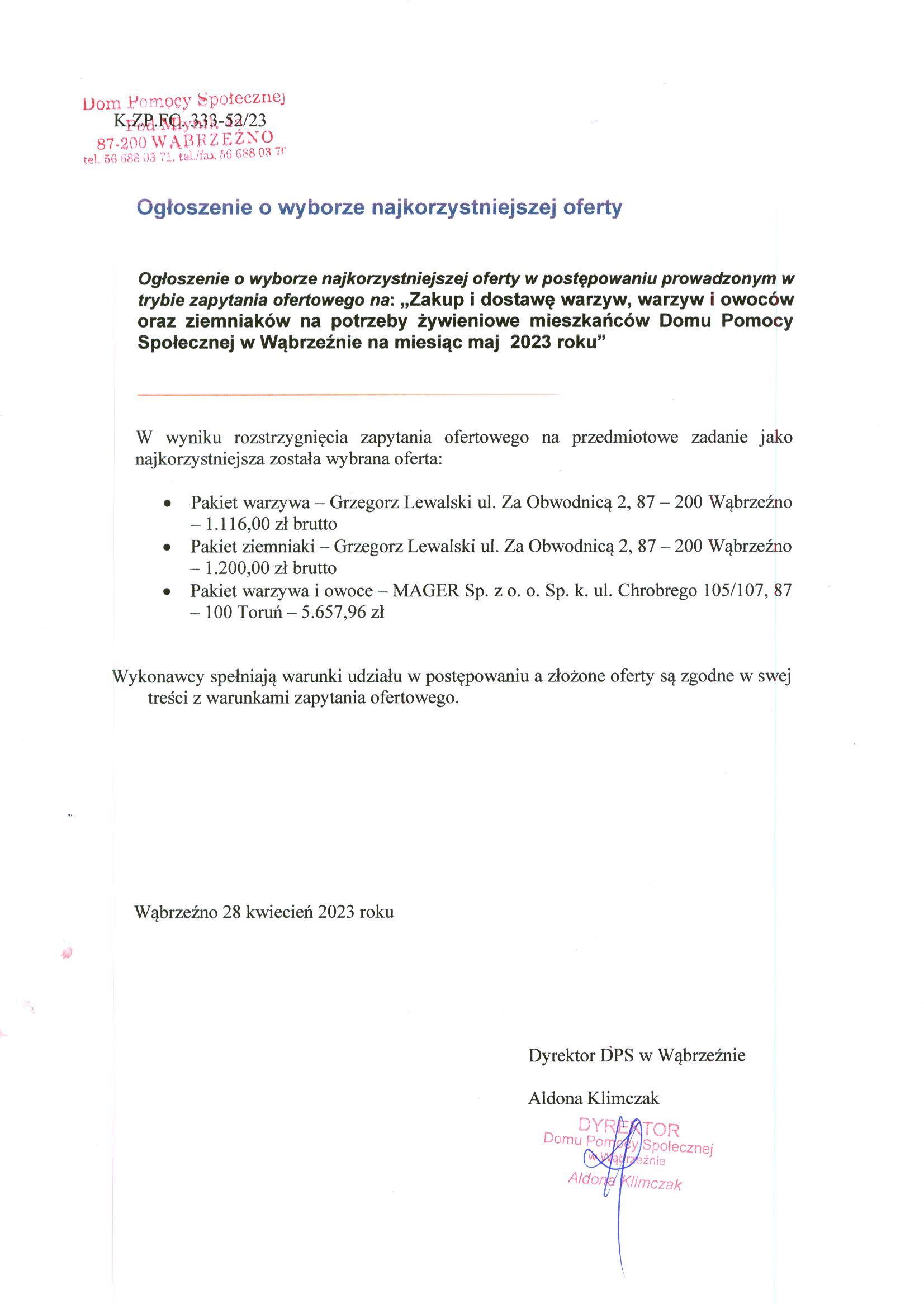 „Zakup i dostawę warzyw, warzyw i owoców oraz ziemniaków na potrzeby żywieniowe mieszkańców Domu Pomocy Społecznej w Wąbrzeźnie na miesiąc maj 2023 roku”