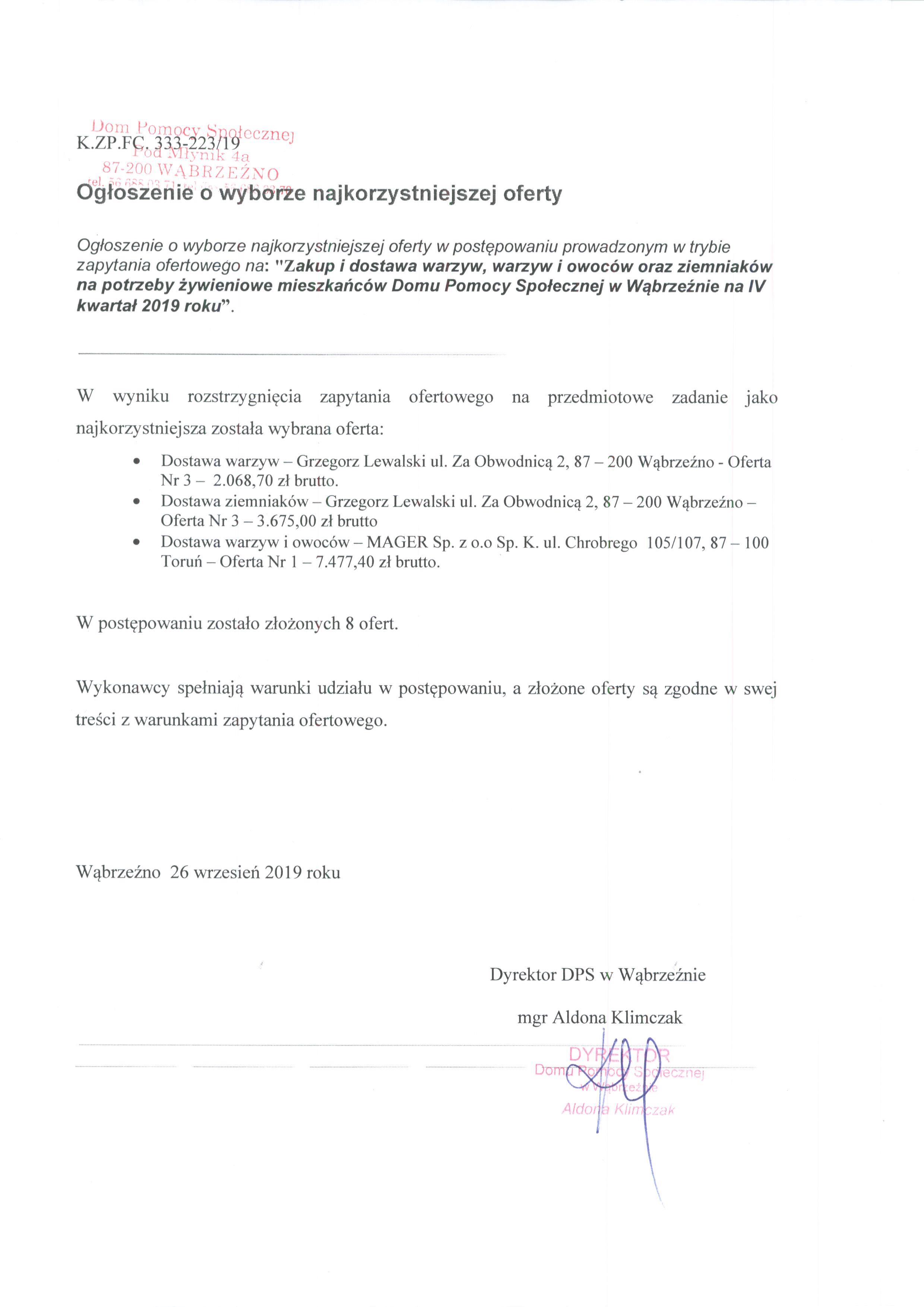 W wyniku rozstrzygnięcia zapytania ofertowego na przedmiotowe zadanie jako najkorzystniejsza została wybrana oferta: · Dostawa warzyw – Grzegorz Lewalski ul. Za Obwodnicą 2, 87 – 200 Wąbrzeźno – Oferta Nr 3 – 2.068,70 zł brutto. · Dostawa ziemniaków – Grzegorz Lewalski ul. Za Obwodnicą 2, 87 – 200 Wąbrzeźno – Oferta Nr 3 – 3.675,00 zł brutto · Dostawa warzyw i owoców – MAGER Sp. z o.o Sp. K. ul. Chrobrego 105/107, 87 – 100 Toruń – Oferta Nr 1 – 7.477,40 zł brutto.