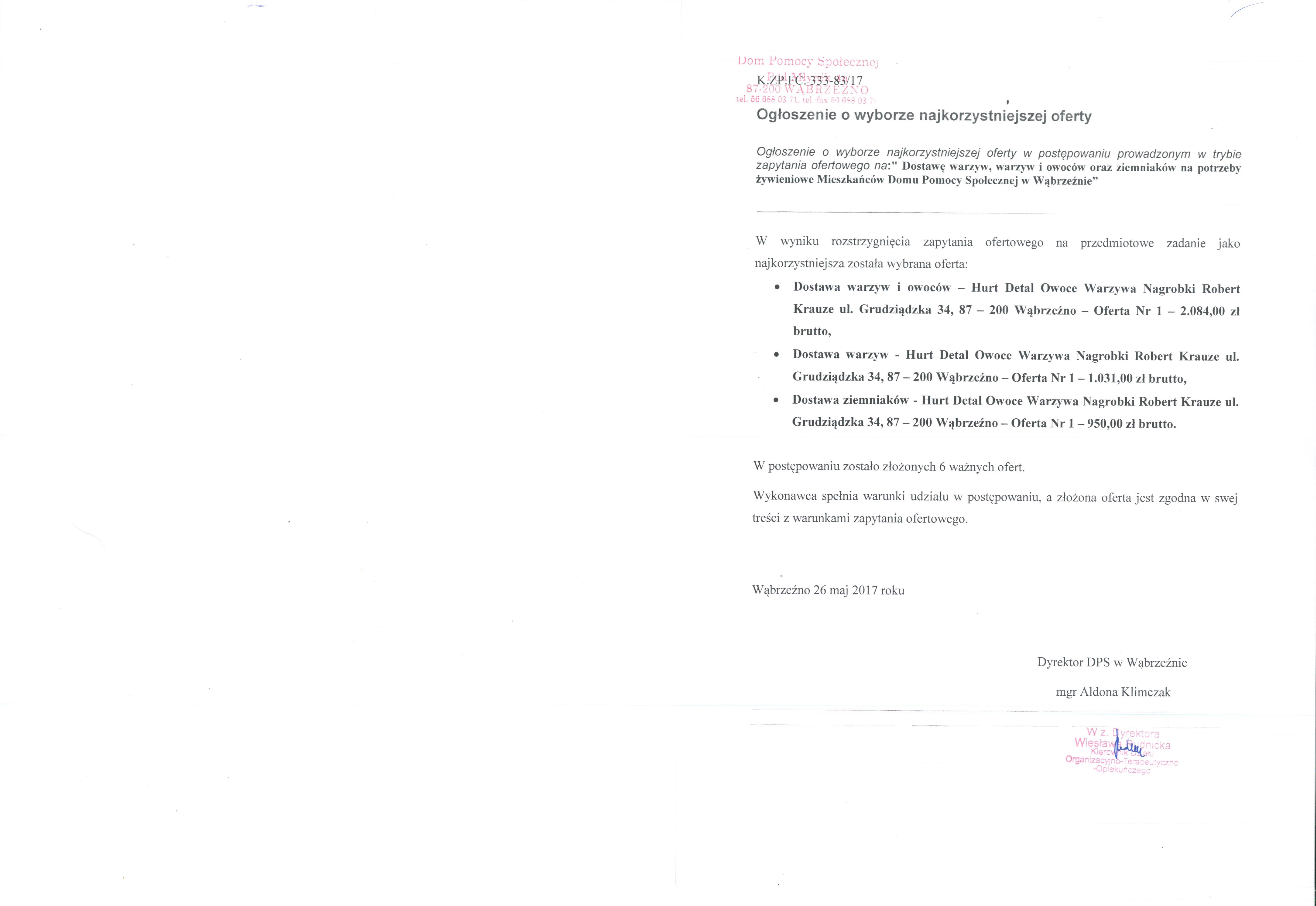 Ogłoszenie o wyborze najkorzystniejszej oferty w postępowaniu prowadzonym w trybie zapytania ofertowego na:” Dostawę warzyw, warzyw i owoców oraz ziemniaków na potrzeby żywieniowe Mieszkańców Domu Pomocy Społecznej w Wąbrzeźnie”