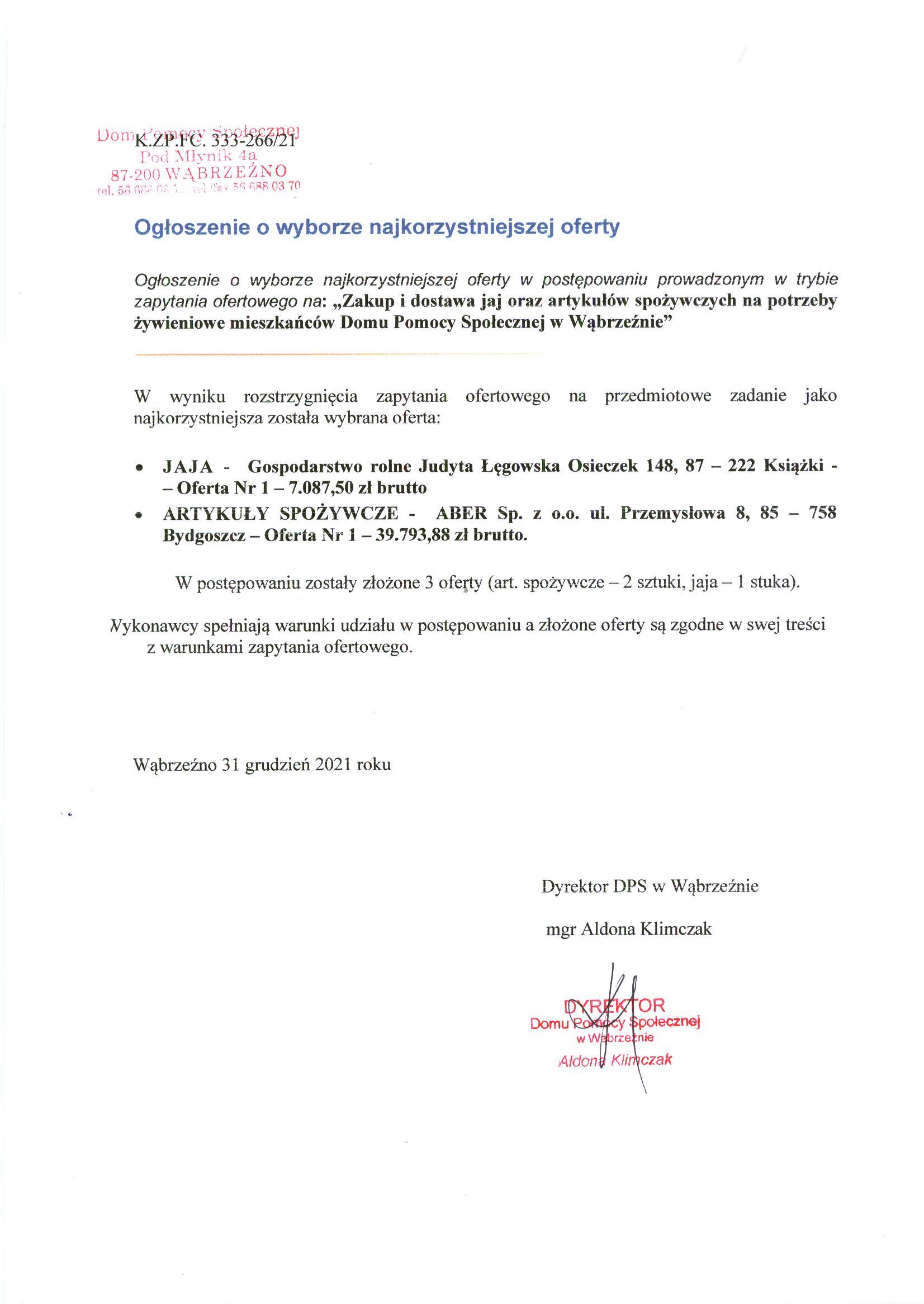 W wyniku rozstrzygnięcia zapytania ofertowego na przedmiotowe zadanie jako najkorzystniejsza została wybrana oferta: · JAJA – Gospodarstwo rolne Judyta Łęgowska Osieczek 148, 87 – 222 Książki – – Oferta Nr 1 – 7.087,50 zł brutto · ARTYKUŁY SPOŻYWCZE – ABER Sp. z o.o. ul. Przemysłowa 8, 85 – 758 Bydgoszcz – Oferta Nr 1 – 39.793,88 zł brutto.