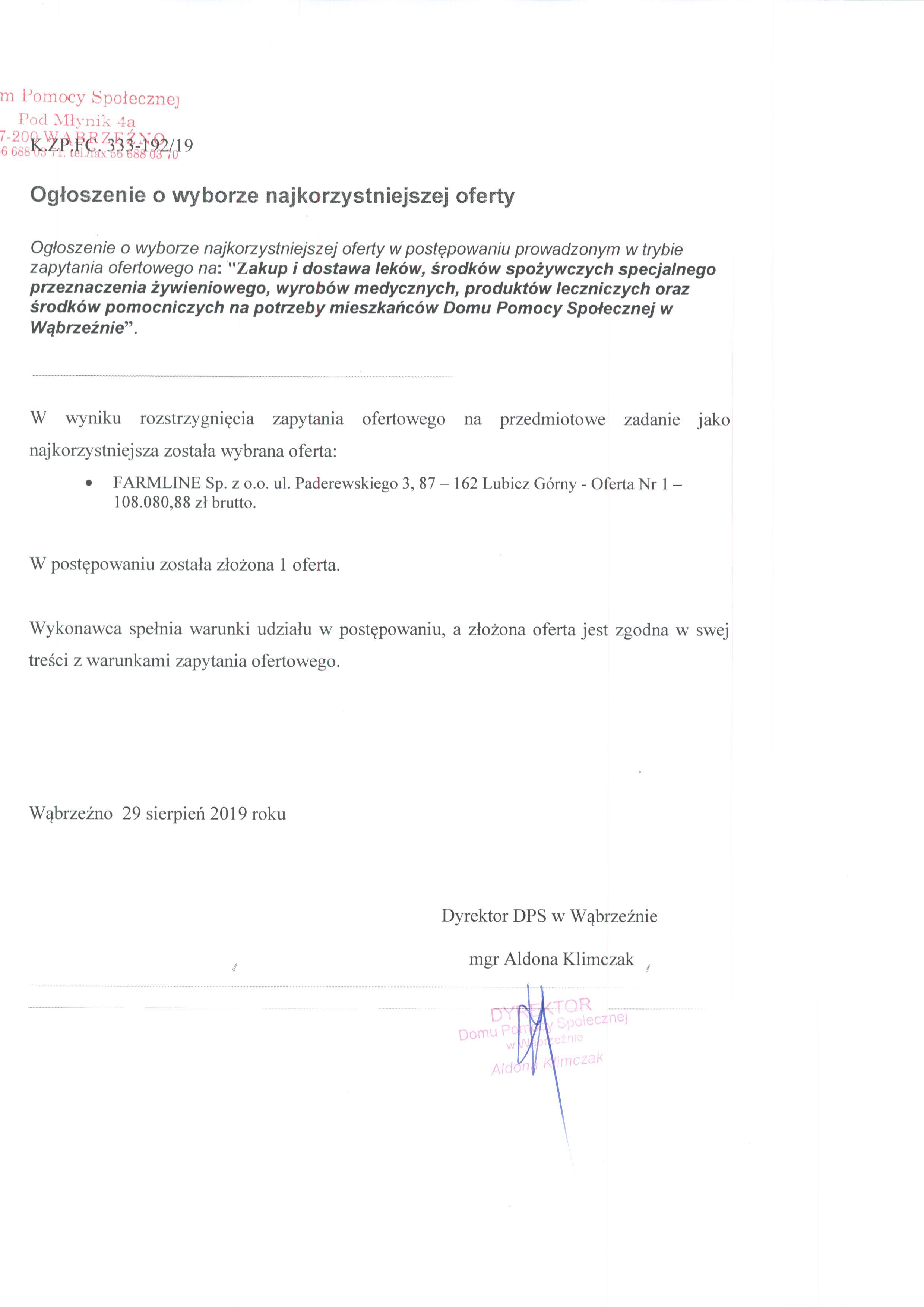 W wyniku rozstrzygnięcia zapytania ofertowego na przedmiotowe zadanie jako najkorzystniejsza została wybrana oferta: FARMLINE Sp. z o.o. ul. Paderewskiego 3, 87 – 162 Lubicz Górny – Oferta Nr 1 – 108.080,88 zł brutto.