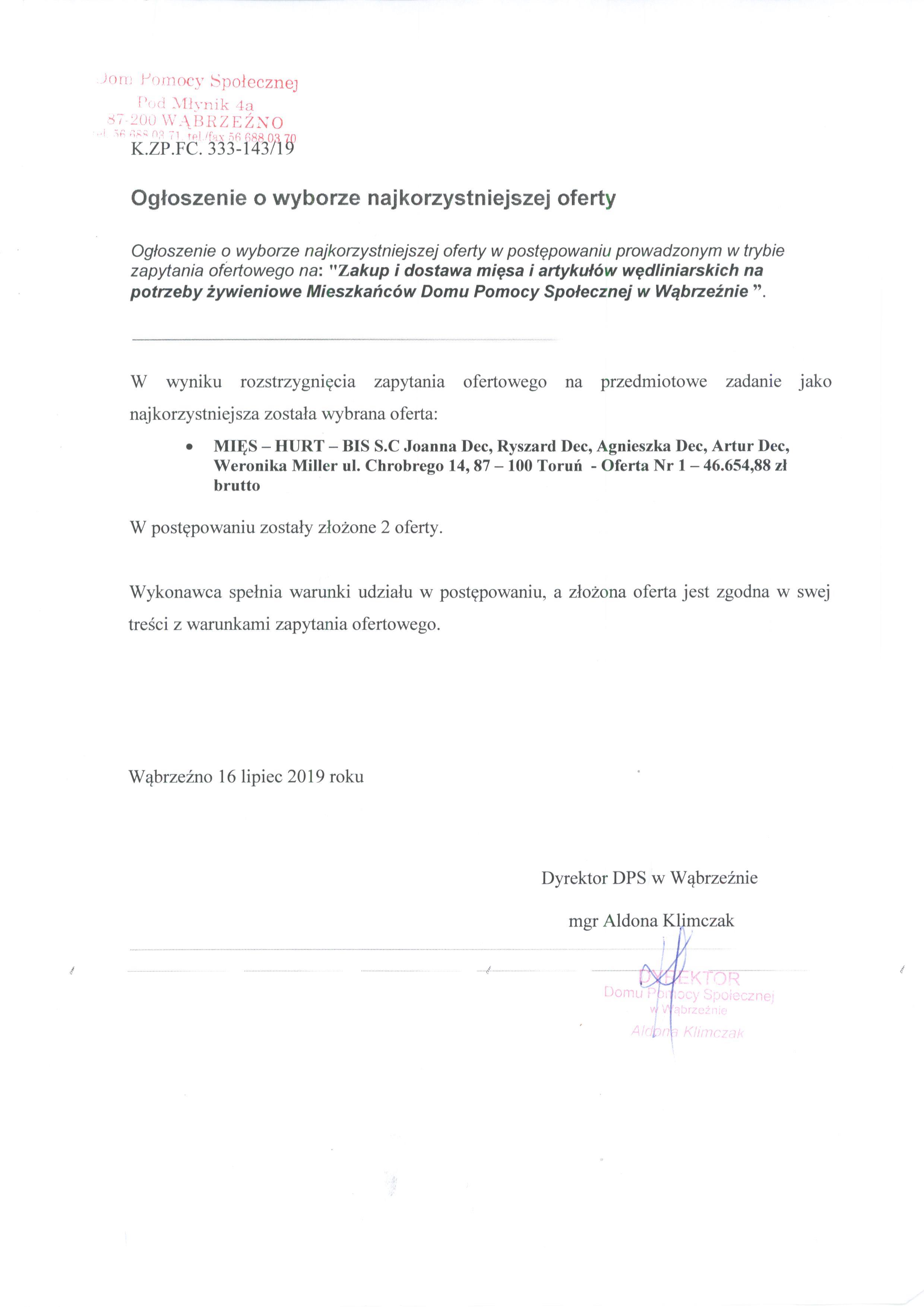 MIĘS – HURT – BIS S.C Joanna Dec, Ryszard Dec, Agnieszka Dec, Artur Dec, Weronika Miller ul. Chrobrego 14, 87 – 100 Toruń – Oferta Nr 1 – 46.654,88 zł brutto W postępowaniu zostały złożone 2 oferty. Wykonawca spełnia warunki udziału w postępowaniu, a złożona oferta jest zgodna w swej treści z warunkami zapytania ofertowego.
