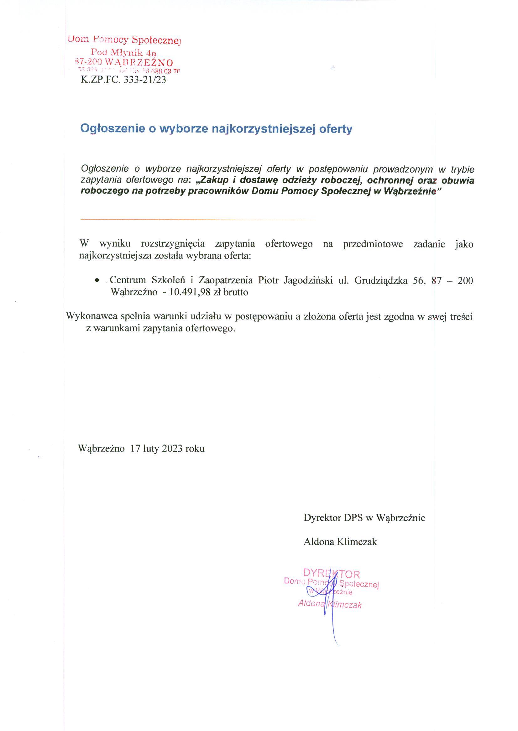 „Zakup i dostawę odzieży roboczej, ochronnej oraz obuwia roboczego na potrzeby pracowników Domu Pomocy Społecznej w Wąbrzeźnie”