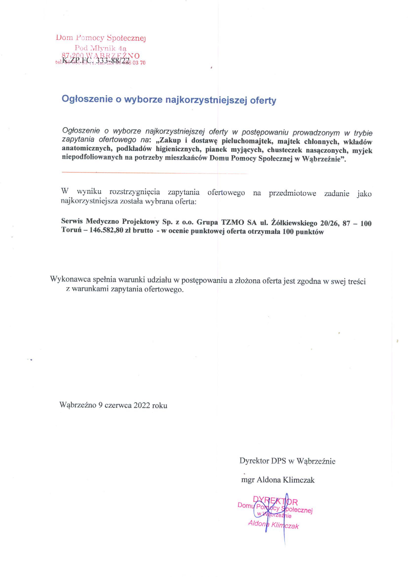 W wyniku rozstrzygnięcia zapytania ofertowego na przedmiotowe zadanie jako najkorzystniejsza została wybrana oferta: