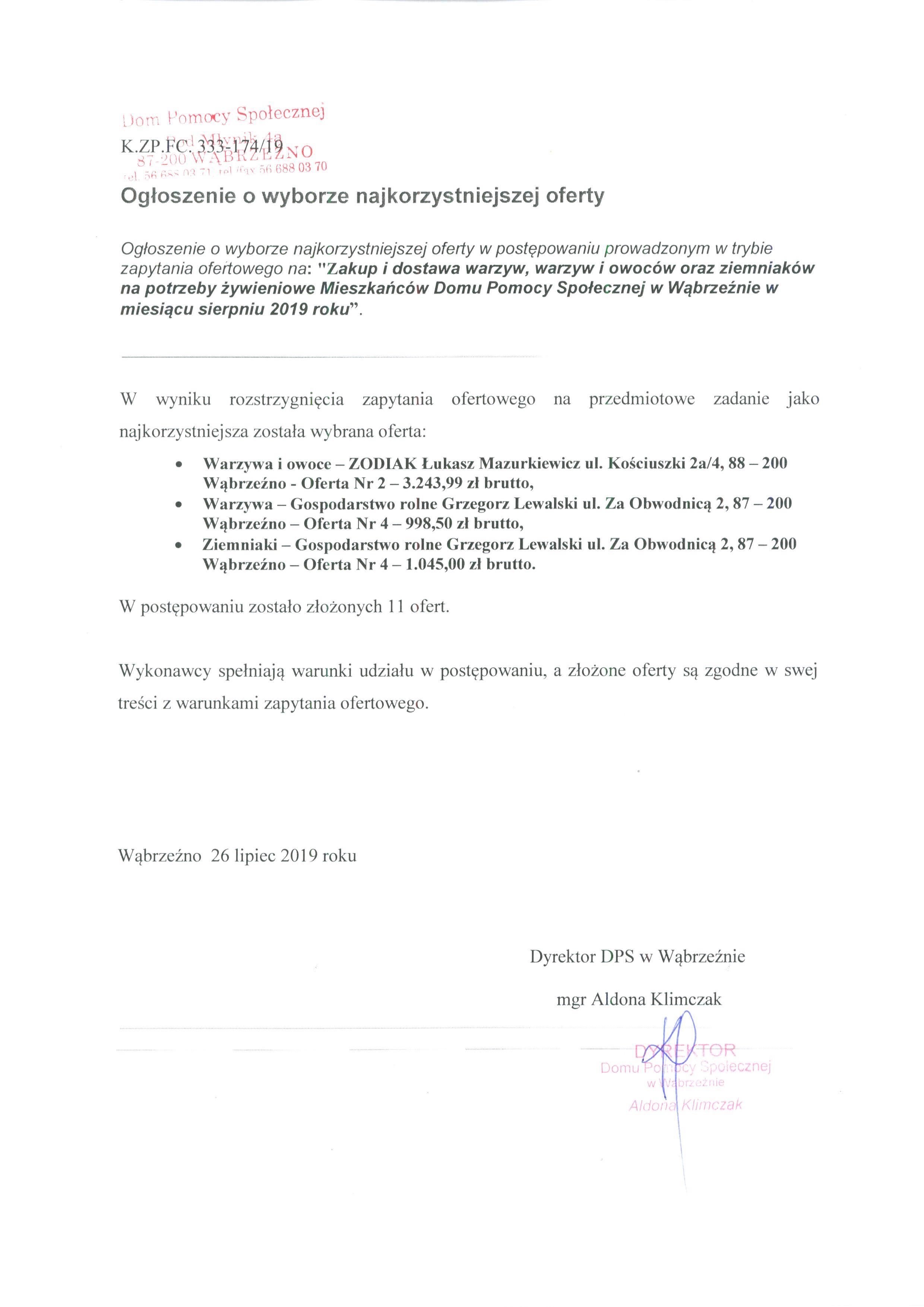 „Zakup i dostawa warzyw, warzyw i owoców oraz ziemniaków na potrzeby żywieniowe Mieszkańców Domu Pomocy Społecznej w Wąbrzeźnie w miesiącu sierpniu 2019 roku”.