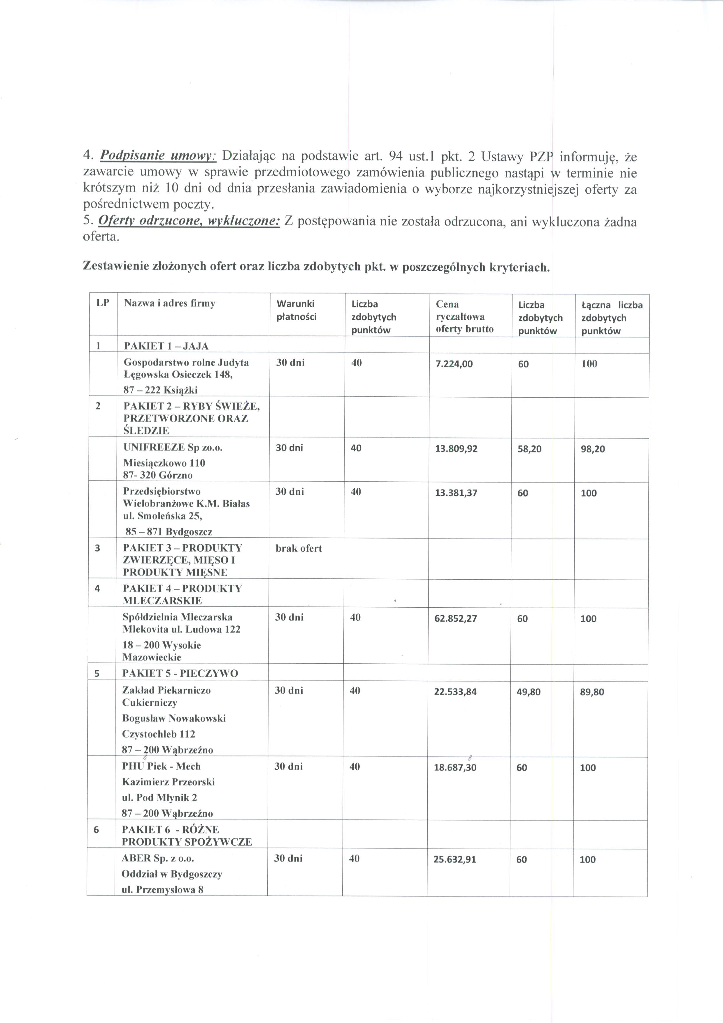 | LP | Nazwa i adres firmy | Warunki płatności | Liczba zdobytych punktów | Cena ryczałtowa oferty brutto | Liczba zdobytych punktów | Łączna liczba zdobytych punktów |