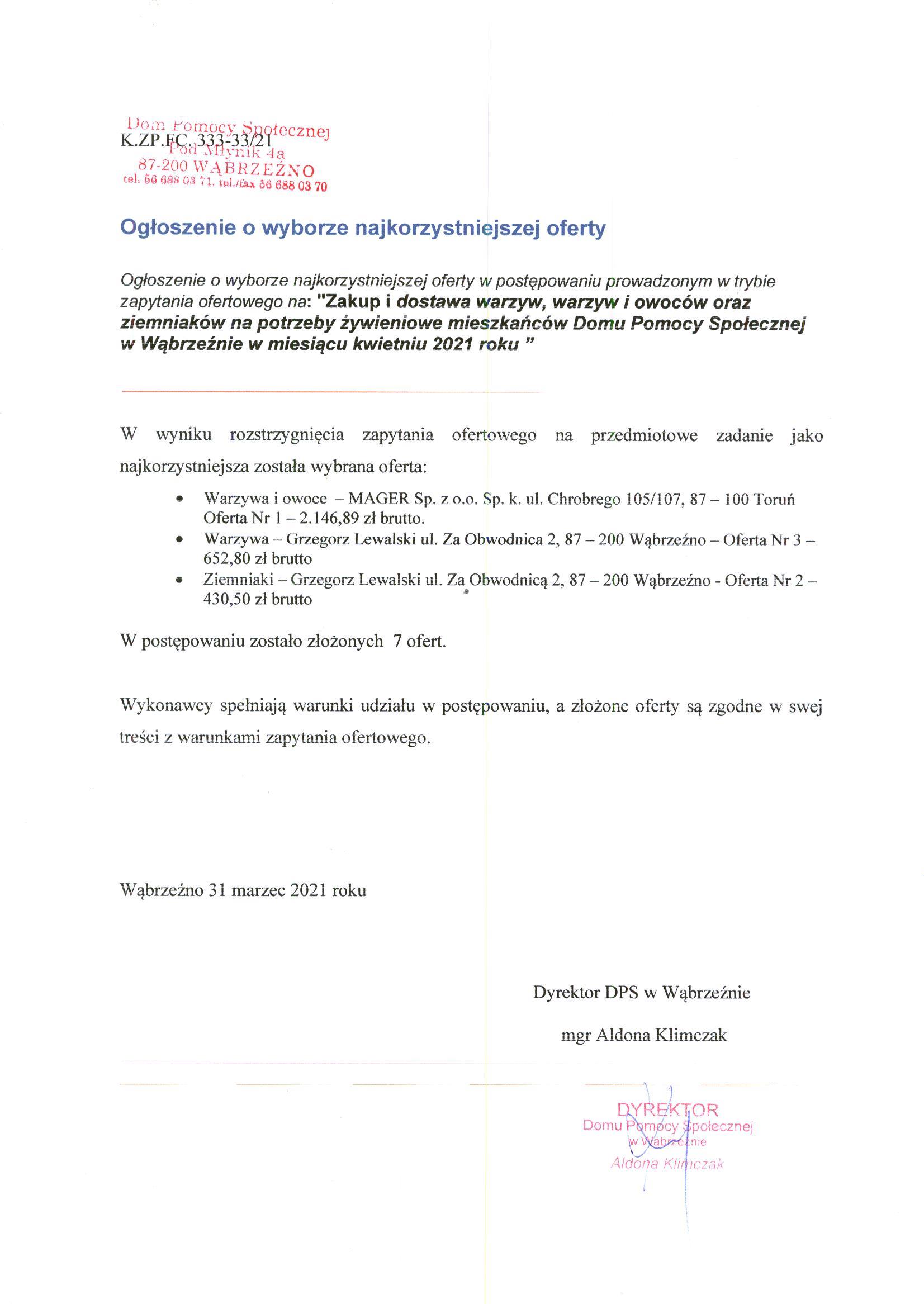 „Zakup i dostawa warzyw, warzyw i owoców oraz ziemniaków na potrzeby żywieniowe mieszkańców Domu Pomocy Społecznej w Wąbrzeźnie w miesiącu kwietniu 2021 roku ” |