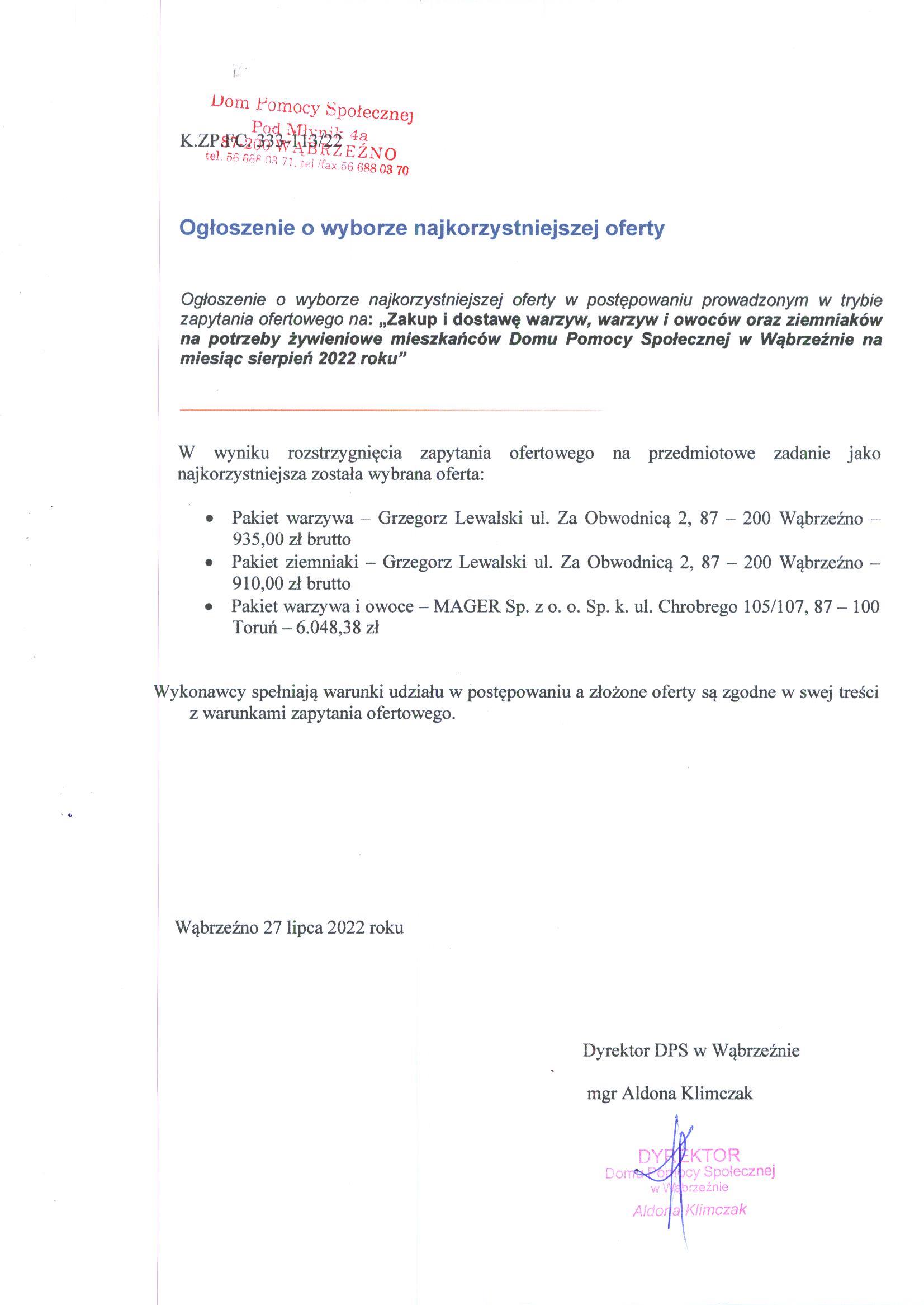 „Zakup i dostawę warzyw, warzyw i owoców oraz ziemniaków na potrzeby żywieniowe mieszkańców Domu Pomocy Społecznej w Wąbrzeźnie na miesiąc sierpień 2022 roku”