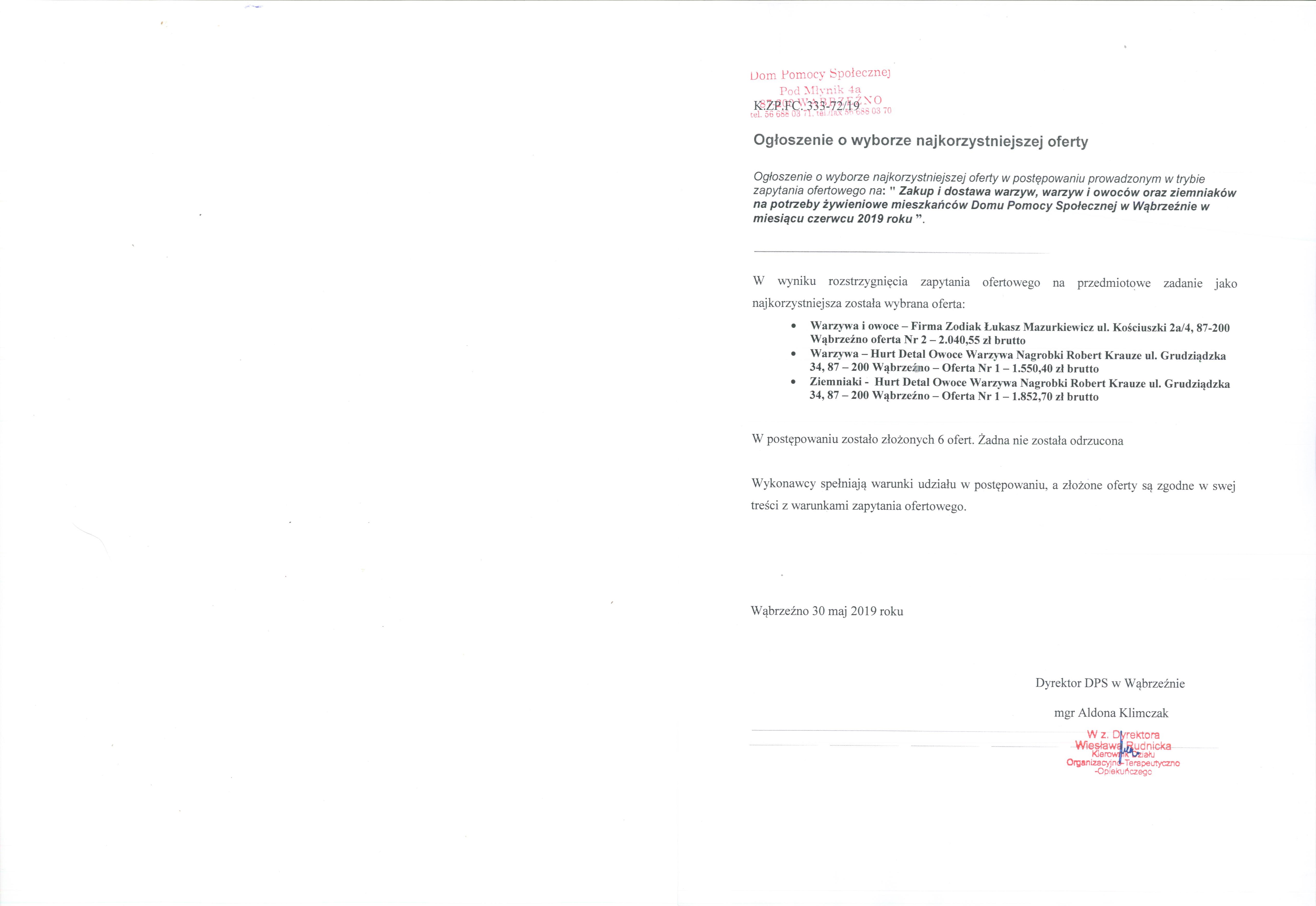 Informacja o wyborze najkorzystniejszej oferty w zapytaniu ofertowym na zakup i dostawę warzyw, warzyw i owoców oraz ziemniaków na potrzeby żywieniowe mieszkańców Domu Pomocy Społecznej w Wąbrzeźnie w miesiącu czerwcu 2019 roku