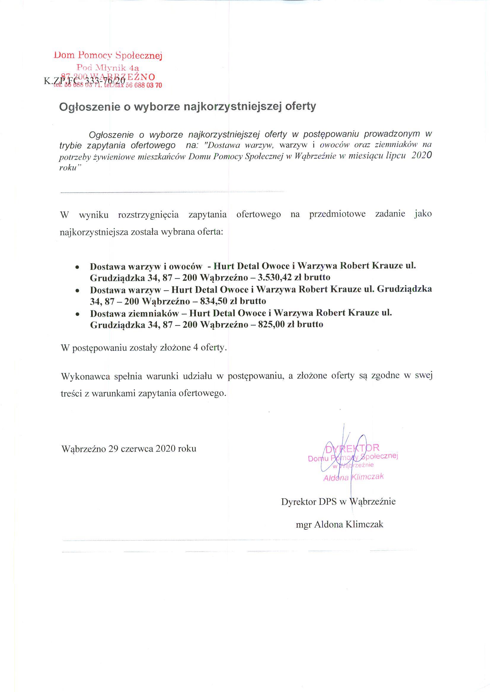 „Dostawa warzyw, warzyw i owoców oraz ziemniaków na potrzeby żywieniowe mieszkańców Domu Pomocy Społecznej w Wąbrzeźnie w miesiącu lipcu 2020 roku” |