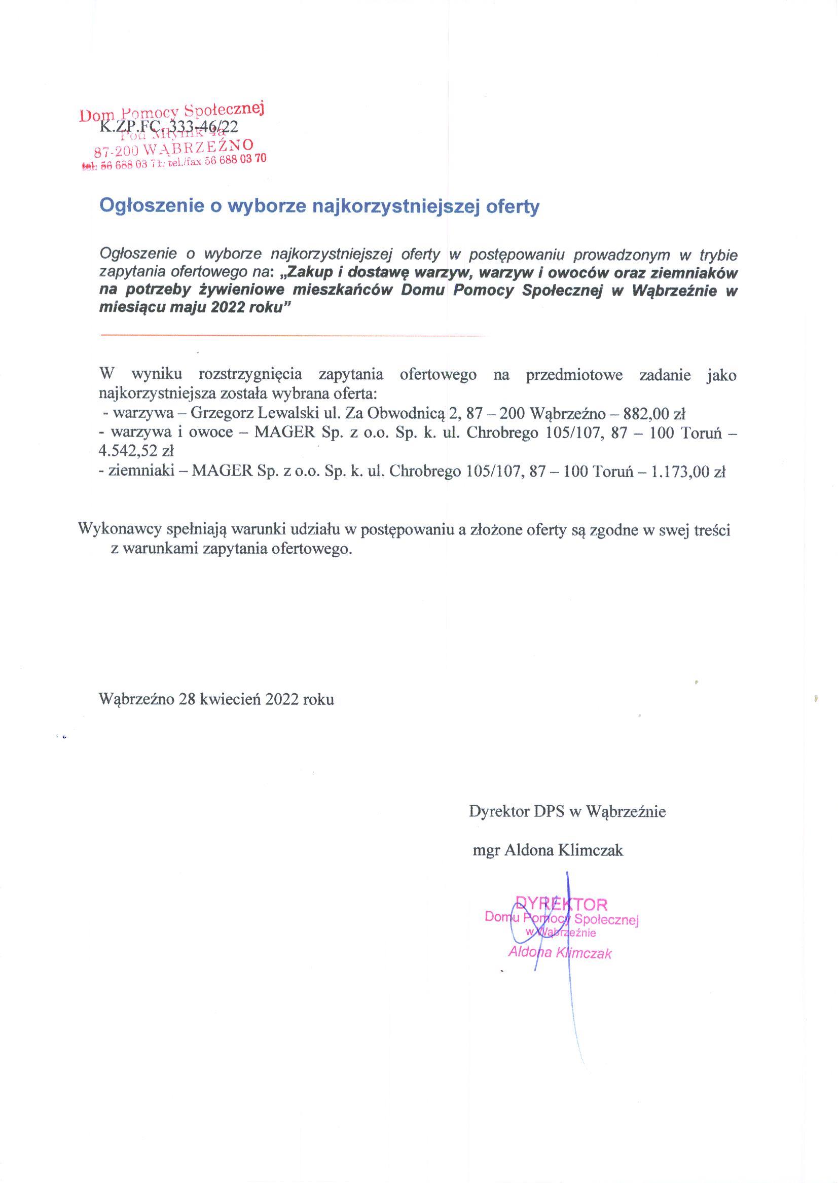 W wyniku rozstrzygnięcia zapytania ofertowego na przedmiotowe zadanie jako najkorzystniejsza została wybrana oferta: – warzywa – Grzegorz Lewalski ul. Za Obwodnicą 2, 87 – 200 Wąbrzeźno – 882,00 zł – warzywa i owoce – MAGER Sp. z o.o. Sp. k. ul. Chrobrego 105/107, 87 – 100 Toruń – 4.542,52 zł – ziemniaki – MAGER Sp. z o.o. Sp. k. ul. Chrobrego 105/107, 87 – 100 Toruń – 1.173,00 zł