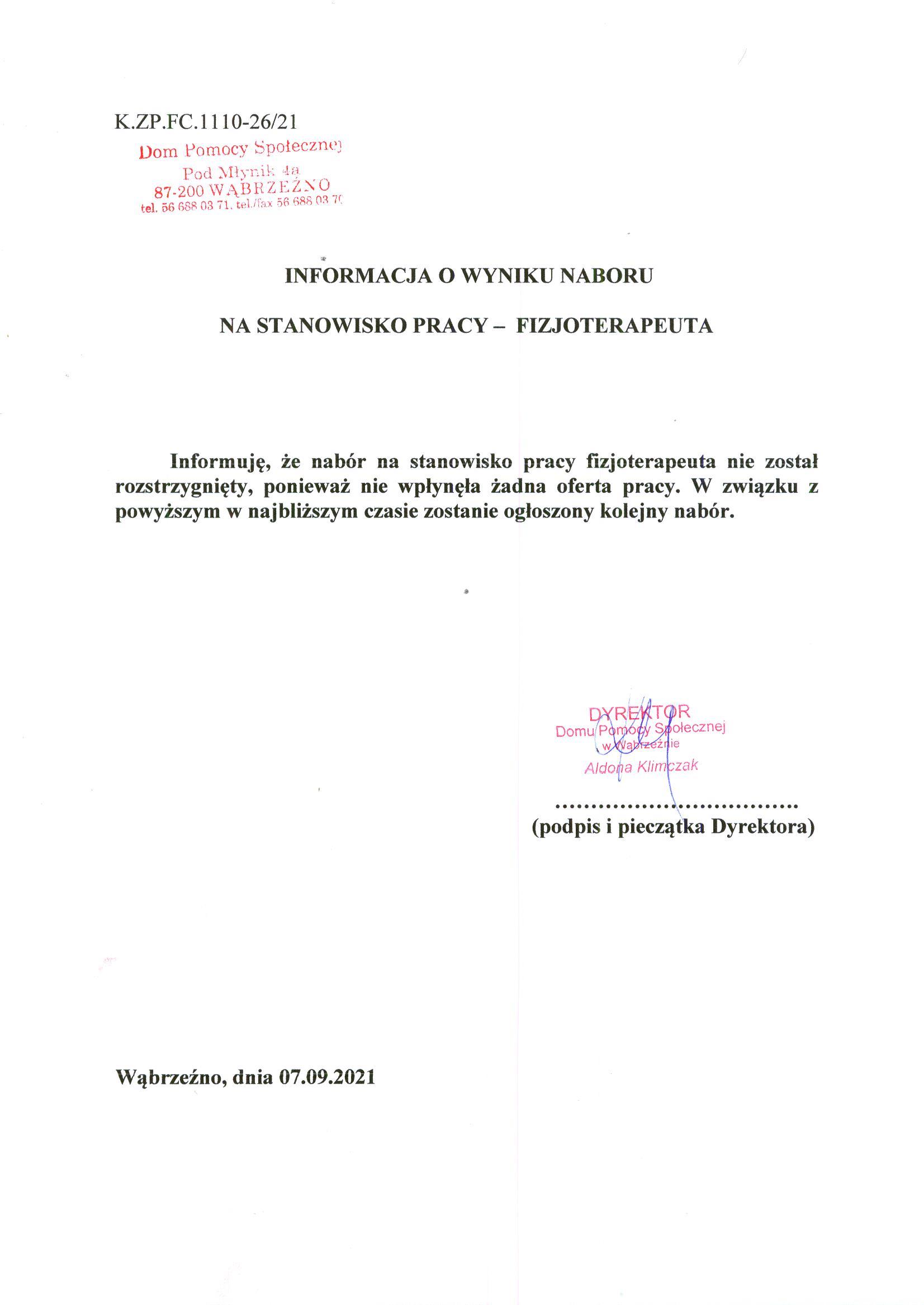 Informuję, że nabór na stanowisko pracy fizjoterapeuta nie został rozstrzygnięty, ponieważ nie wpłynęła żadna oferta pracy. W związku z powyższym w najbliższym czasie zostanie ogłoszony kolejny nabór.