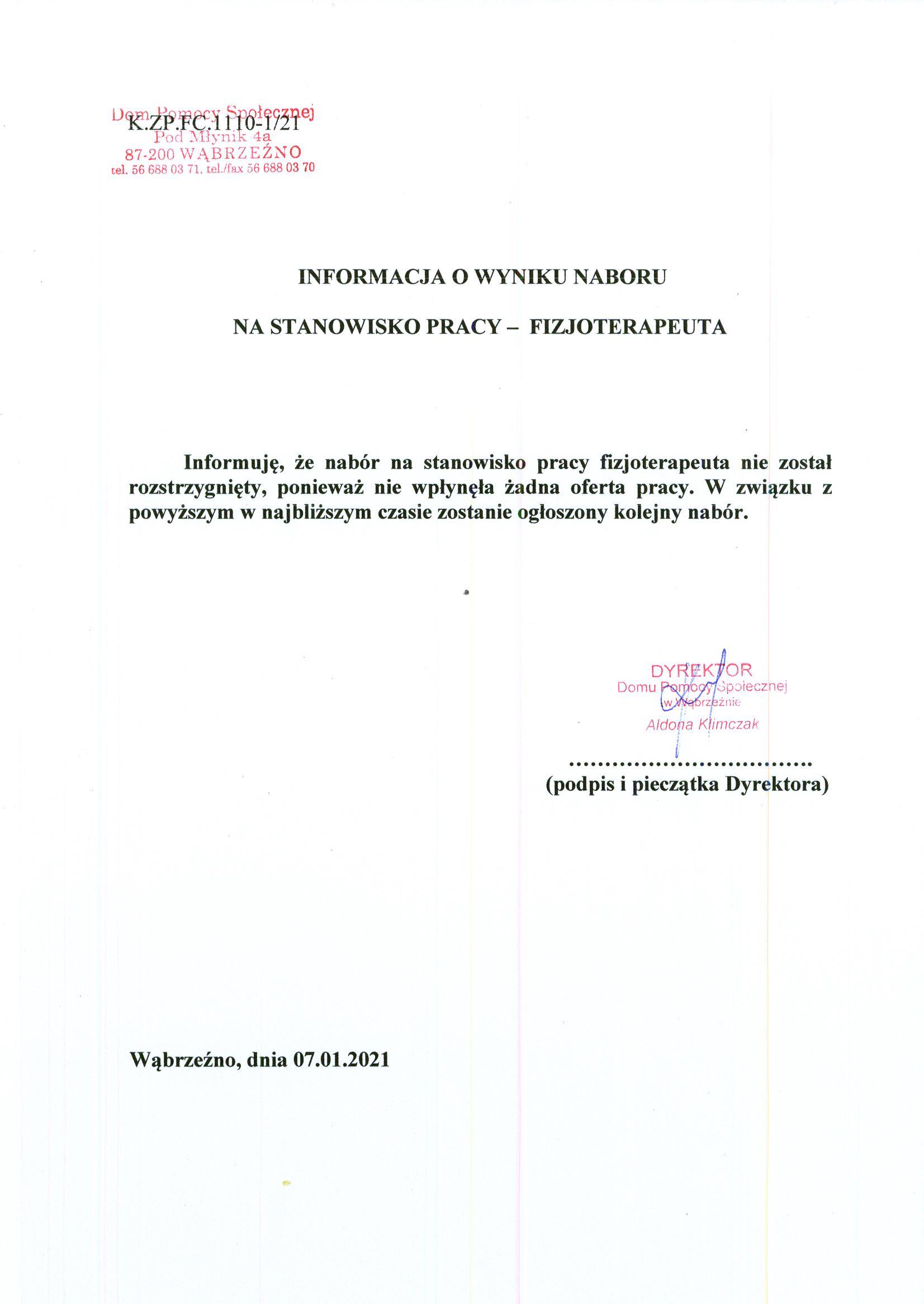 Informuję, że nabór na stanowisko pracy fizjoterapeuta nie został rozstrzygnięty, ponieważ nie wpłynęła żadna oferta pracy. W związku z powyższym w najbliższym czasie zostanie ogłoszony kolejny nabór.