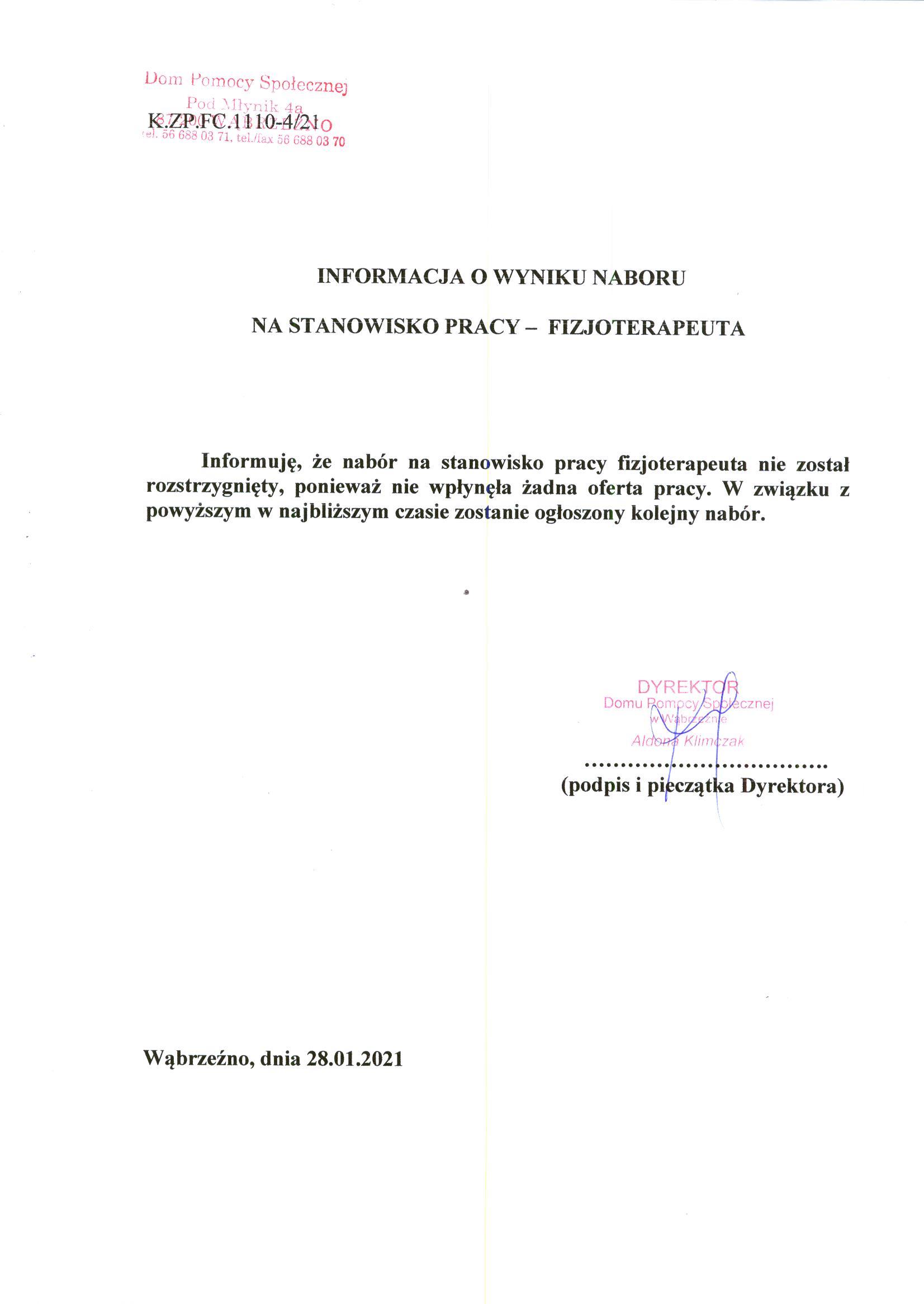 INFORMACJA O WYNIKU NABORU NA STANOWISKO PRACY FIZJOTERAPEUTA