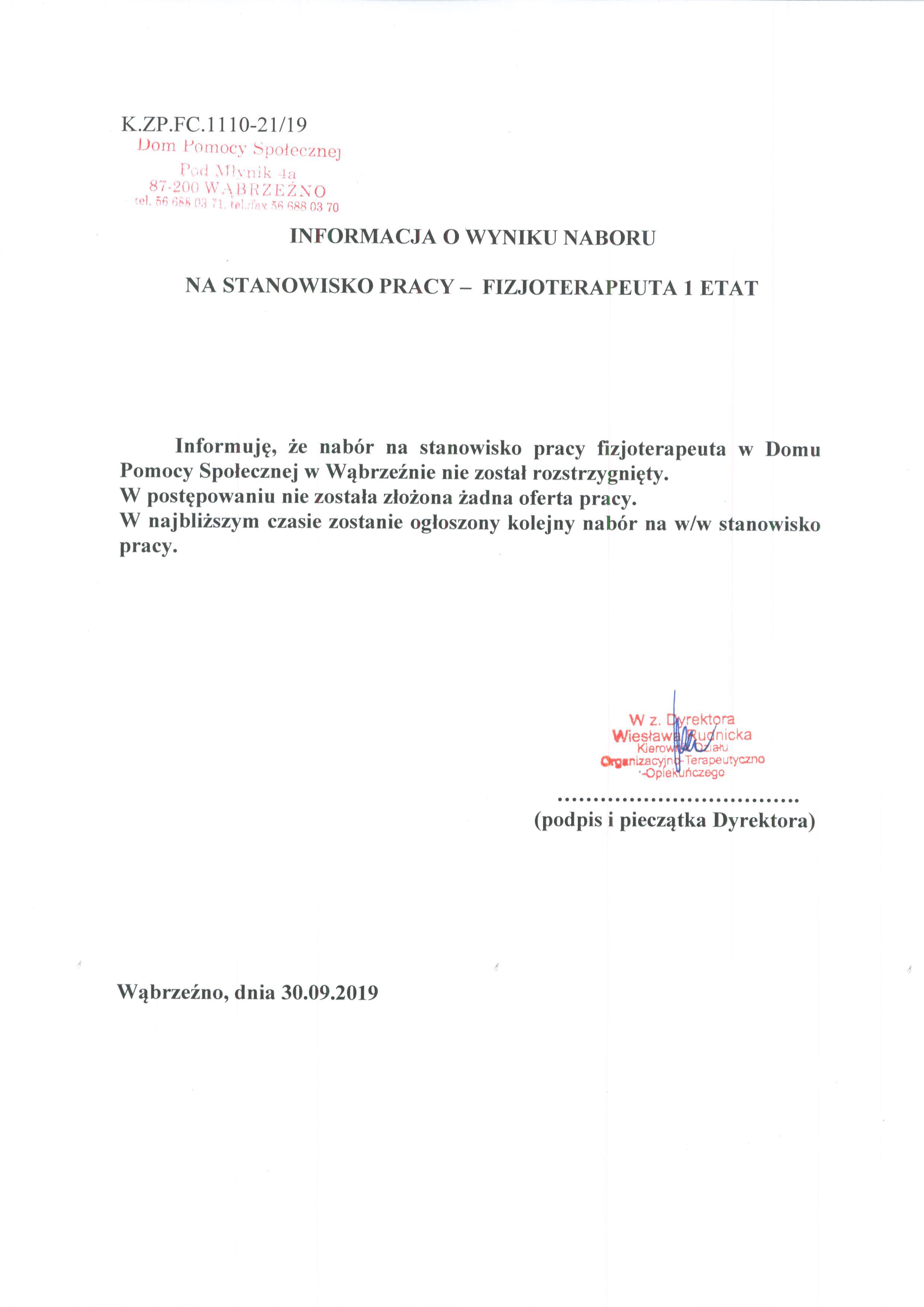 Informuję, że nabór na stanowisko pracy fizjoterapeuta w Domu Pomocy Społecznej w Wąbrzeźnie nie został rozstrzygnięty.