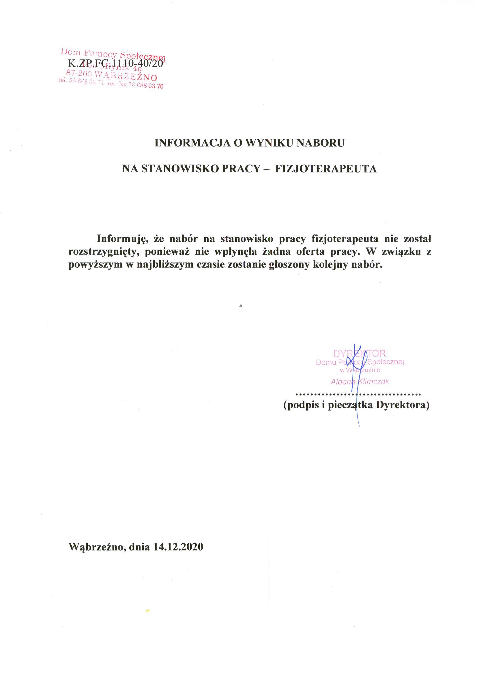 Informuję, że nabór na stanowisko pracy fizjoterapeuta nie został rozstrzygnięty, ponieważ nie wpłynęła żadna oferta pracy. W związku z powyższym w najbliższym czasie zostanie głoszony kolejny nabór.