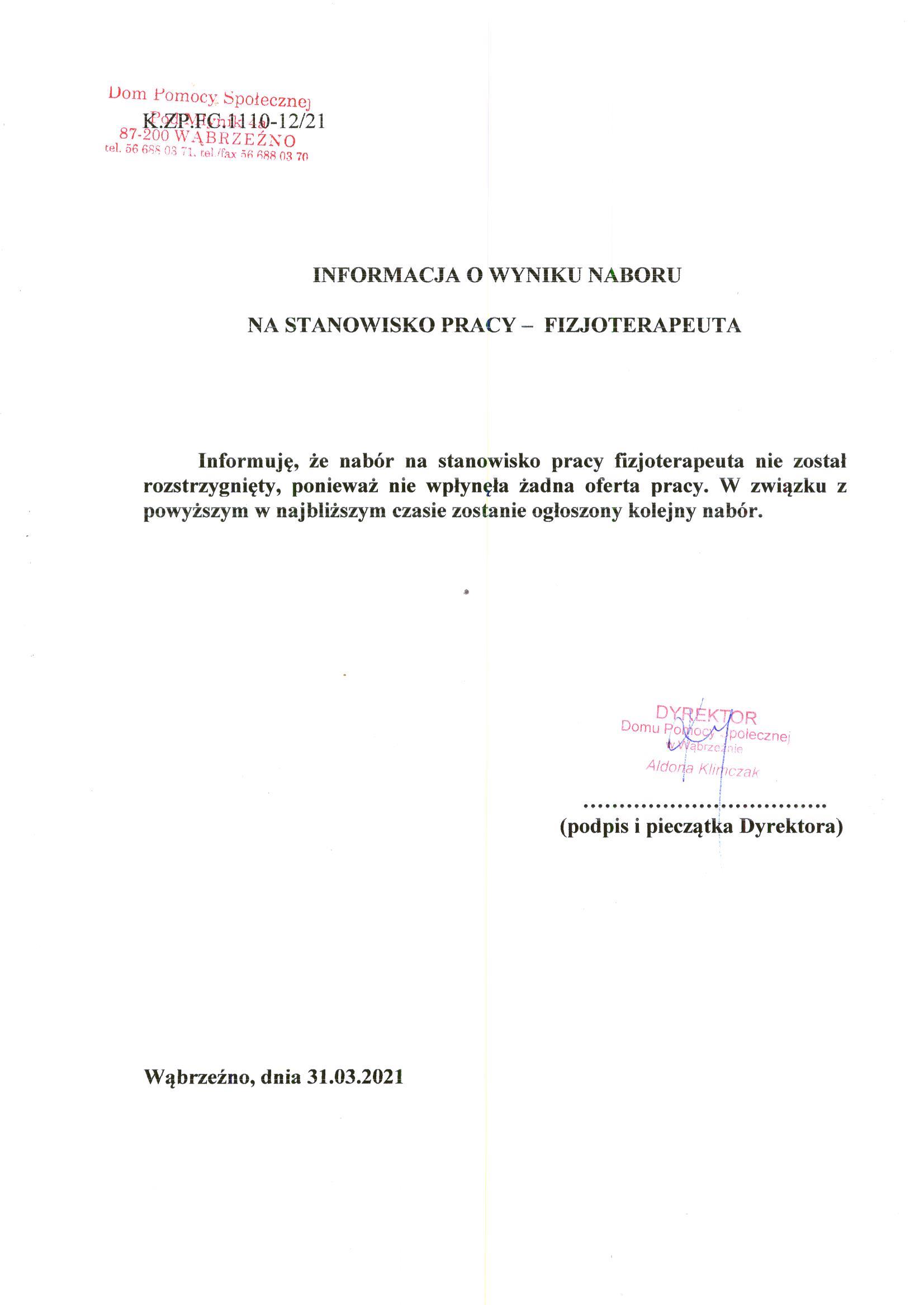 Informuję, że nabór na stanowisko pracy fizjoterapeuta nie został rozstrzygnięty, ponieważ nie wpłynęła żadna oferta pracy. W związku z powyższym w najbliższym czasie zostanie ogłoszony kolejny nabór.