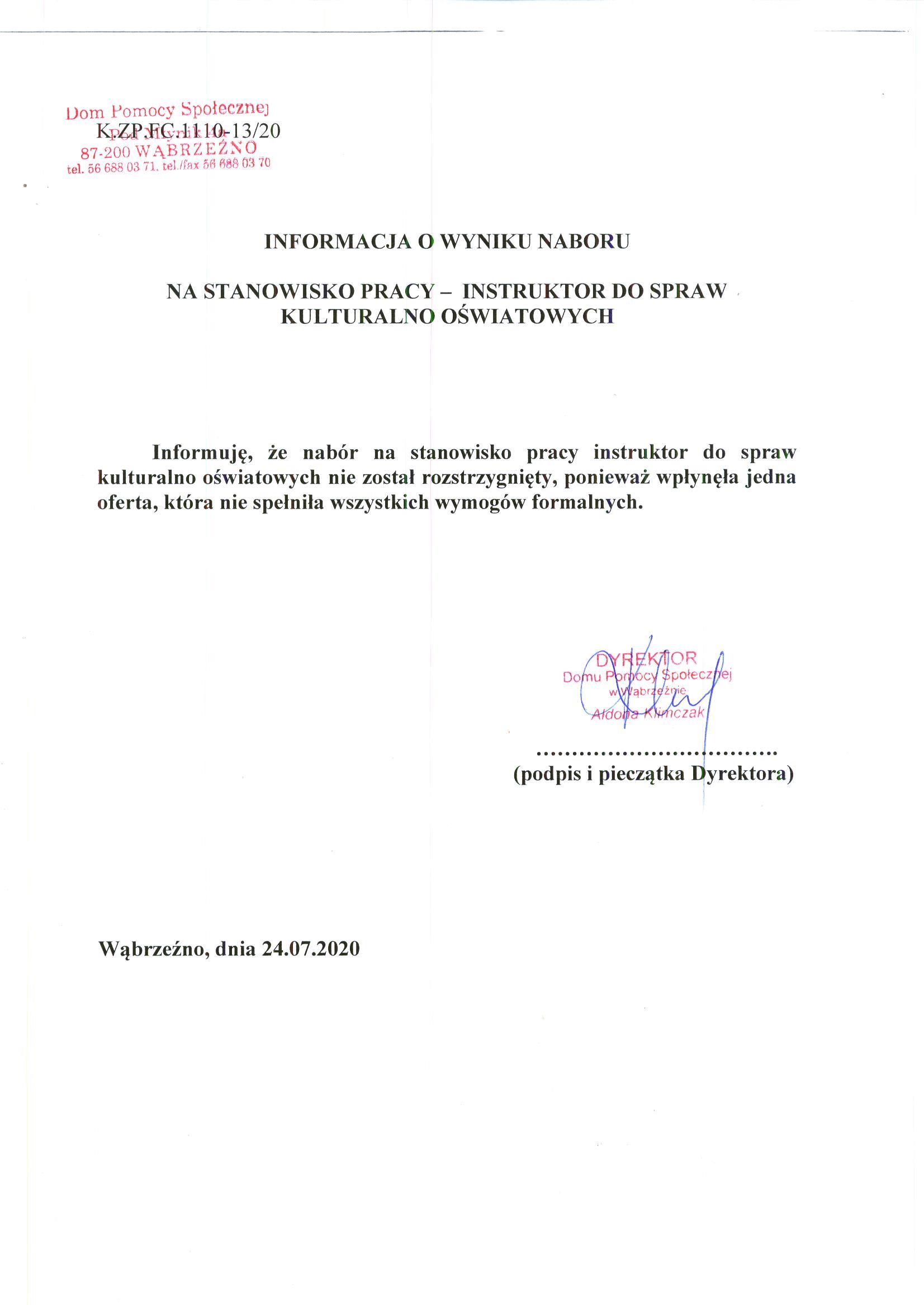 Informuję, że nabór na stanowisko pracy instruktor do spraw kulturalno oświatowych nie został rozstrzygnięty, ponieważ wpłynęła jedna oferta, która nie spełniła wszystkich wymogów formalnych.