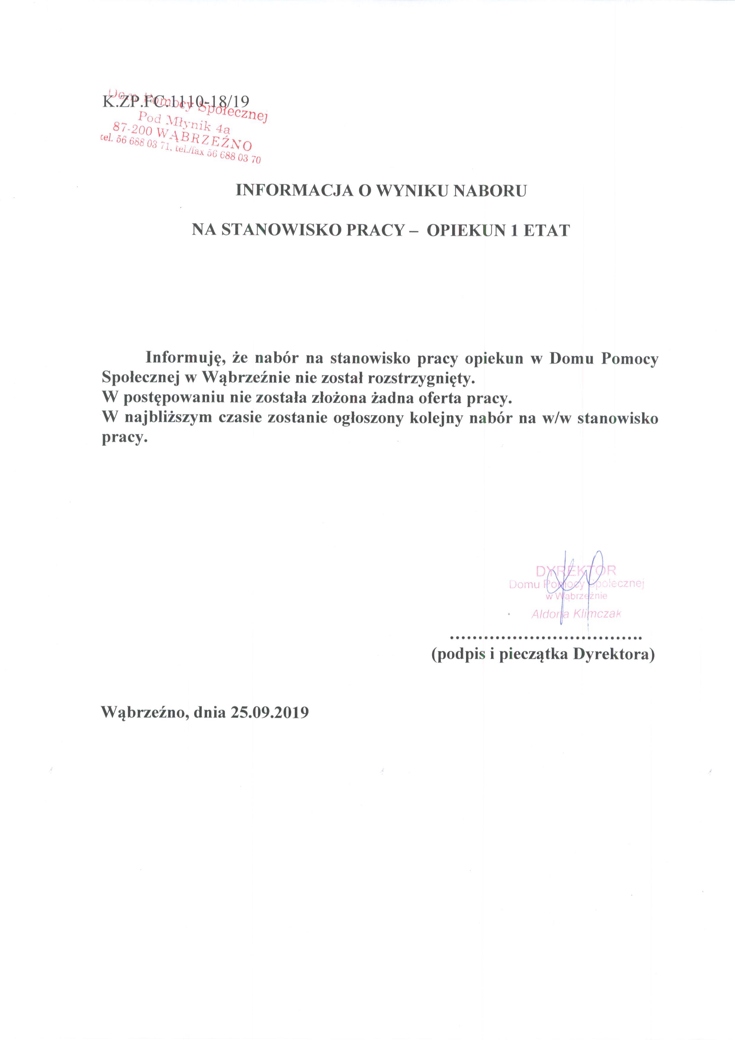 Informuję, że nabór na stanowisko pracy opiekun w Domu Pomocy Społecznej w Wąbrzeźnie nie został rozstrzygnięty. W postępowaniu nie została złożona żadna oferta pracy. W najbliższym czasie zostanie ogłoszony kolejny nabór na w/w stanowisko pracy.