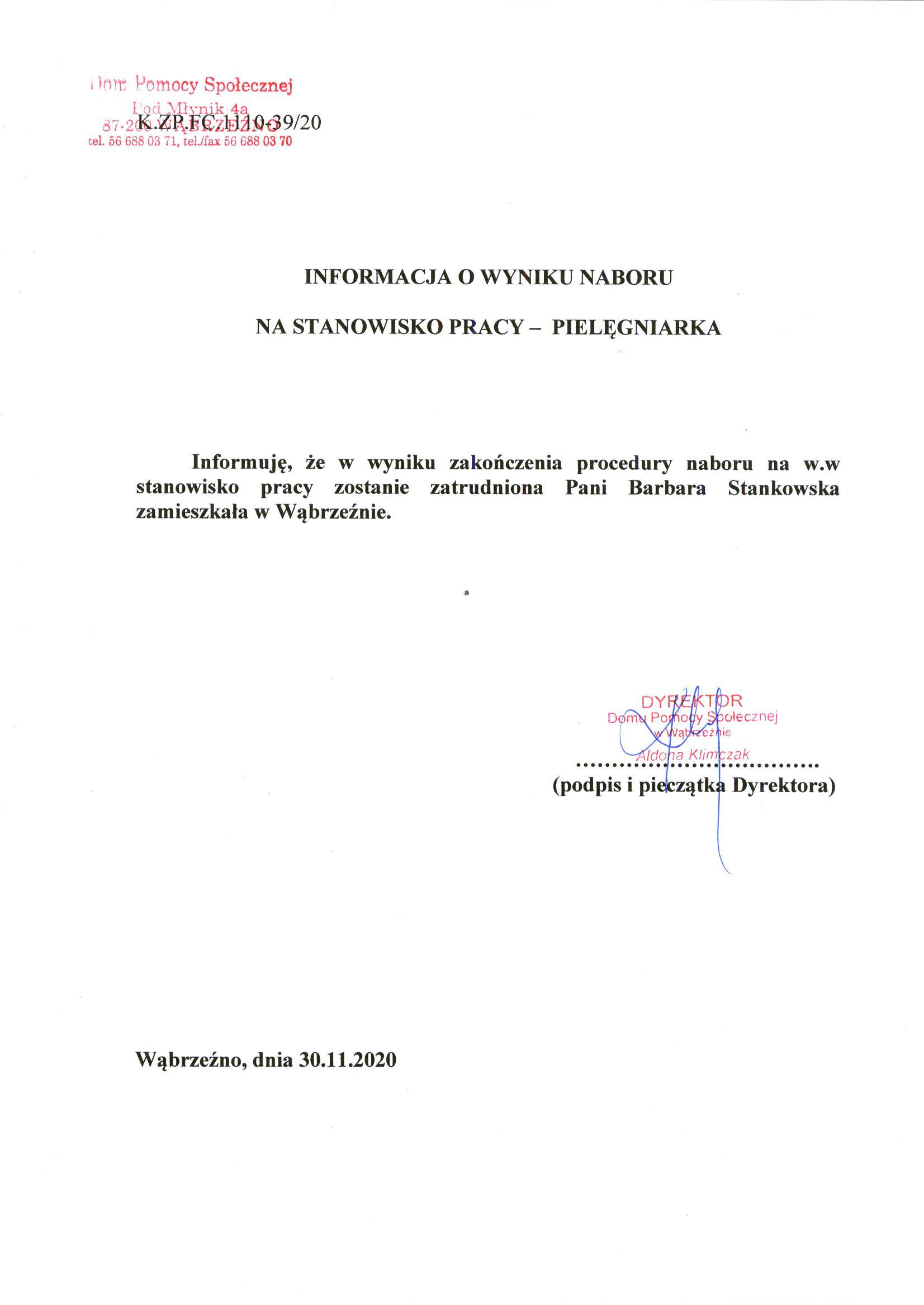 Informuję, że w wyniku zakończenia procedury naboru na w.w stanowisko pracy zostanie zatrudniona Pani Barbara Stankowska zamieszkała w Wąbrzeźnie.