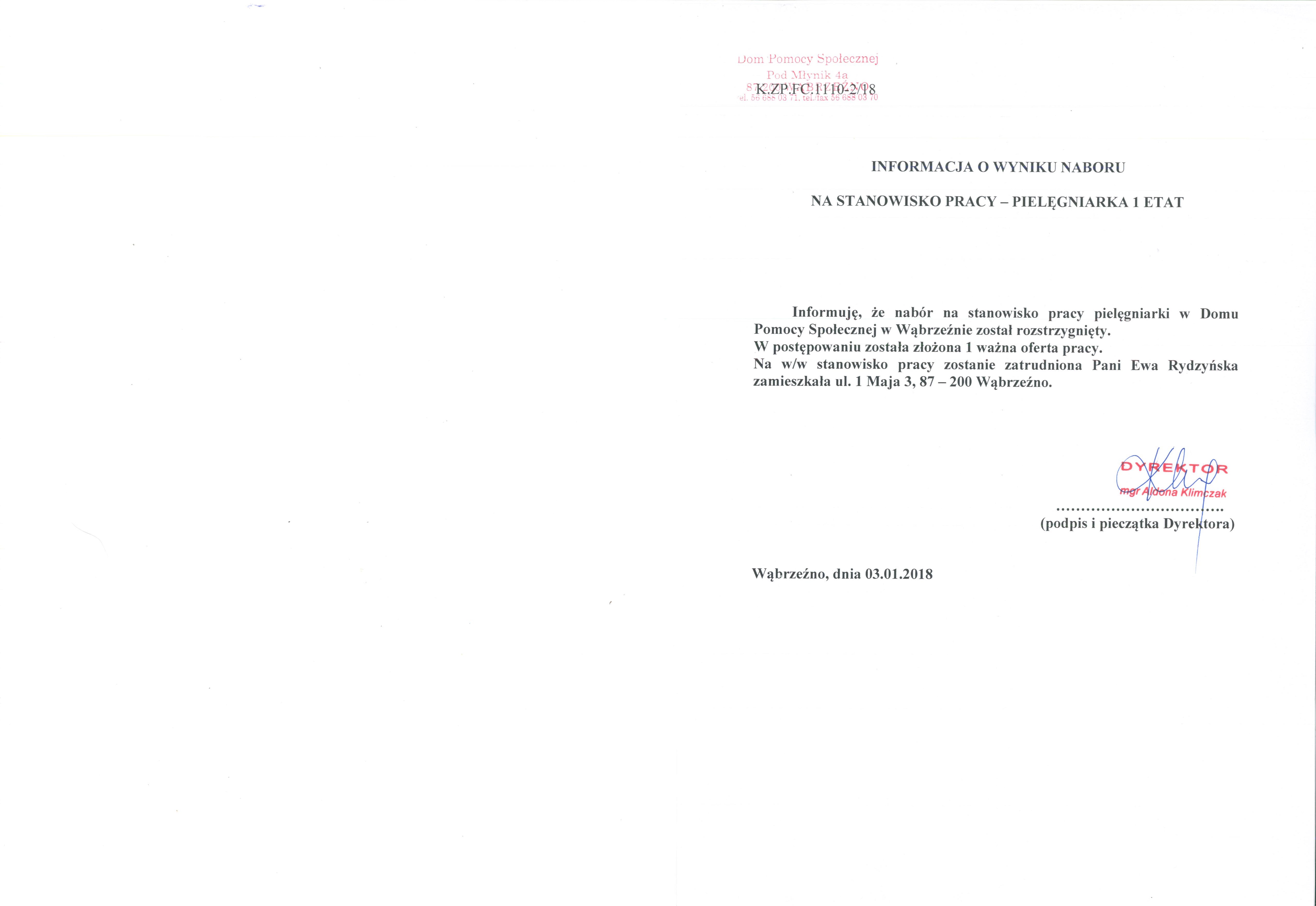 Na w/w stanowisko pracy zostanie zatrudniona Pani Ewa Rydzyńska zamieszkała ul. 1 Maja 3, 87 – 200 Wąbrzeźno.