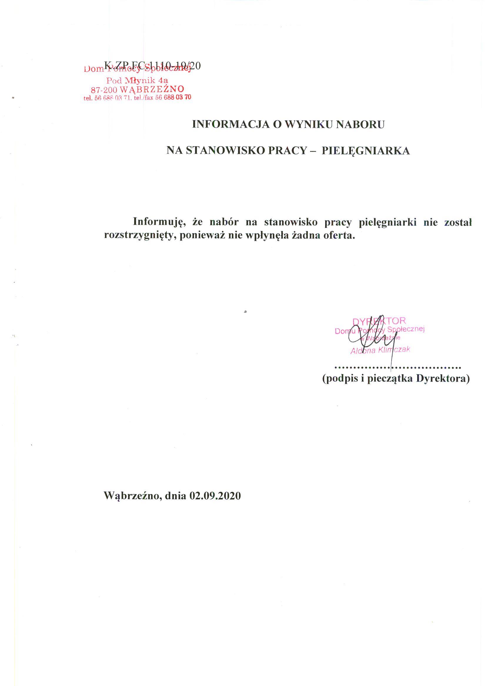 Informuję, iż nabór na stanowisko pracy pielęgniarki nie został rozstrzygnięty, ponieważ nie wpłynęła żadna oferta.