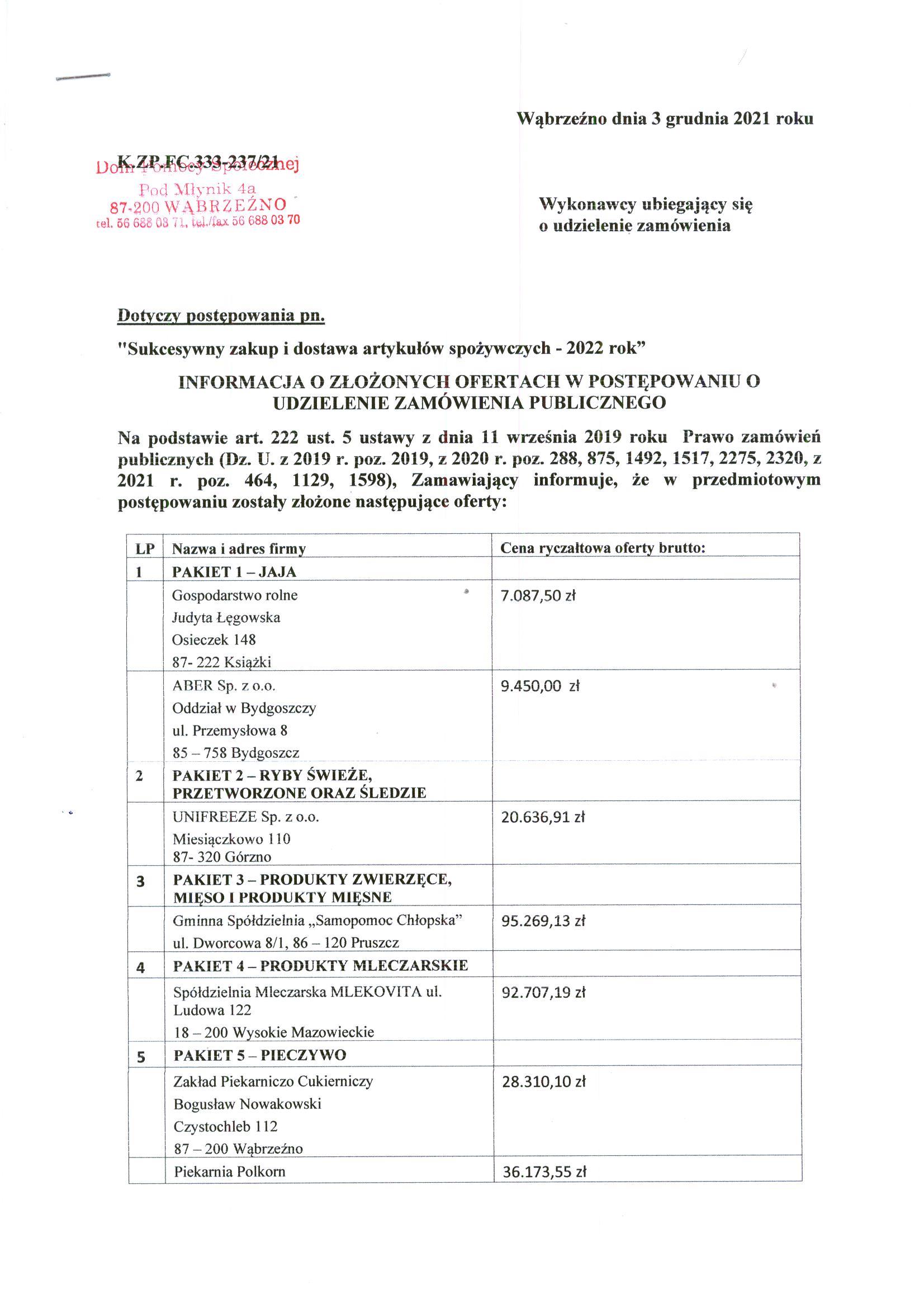 | utworzono: | data: 13:48, 03.12.2021 | przez: Redaktor DPS | Informacja o złożonych ofertach w postępowaniu o udzielenie zamówienia publicznego:"Sukcesywny zakup i dostawa artykułów spożywczych - 2022 roku" |