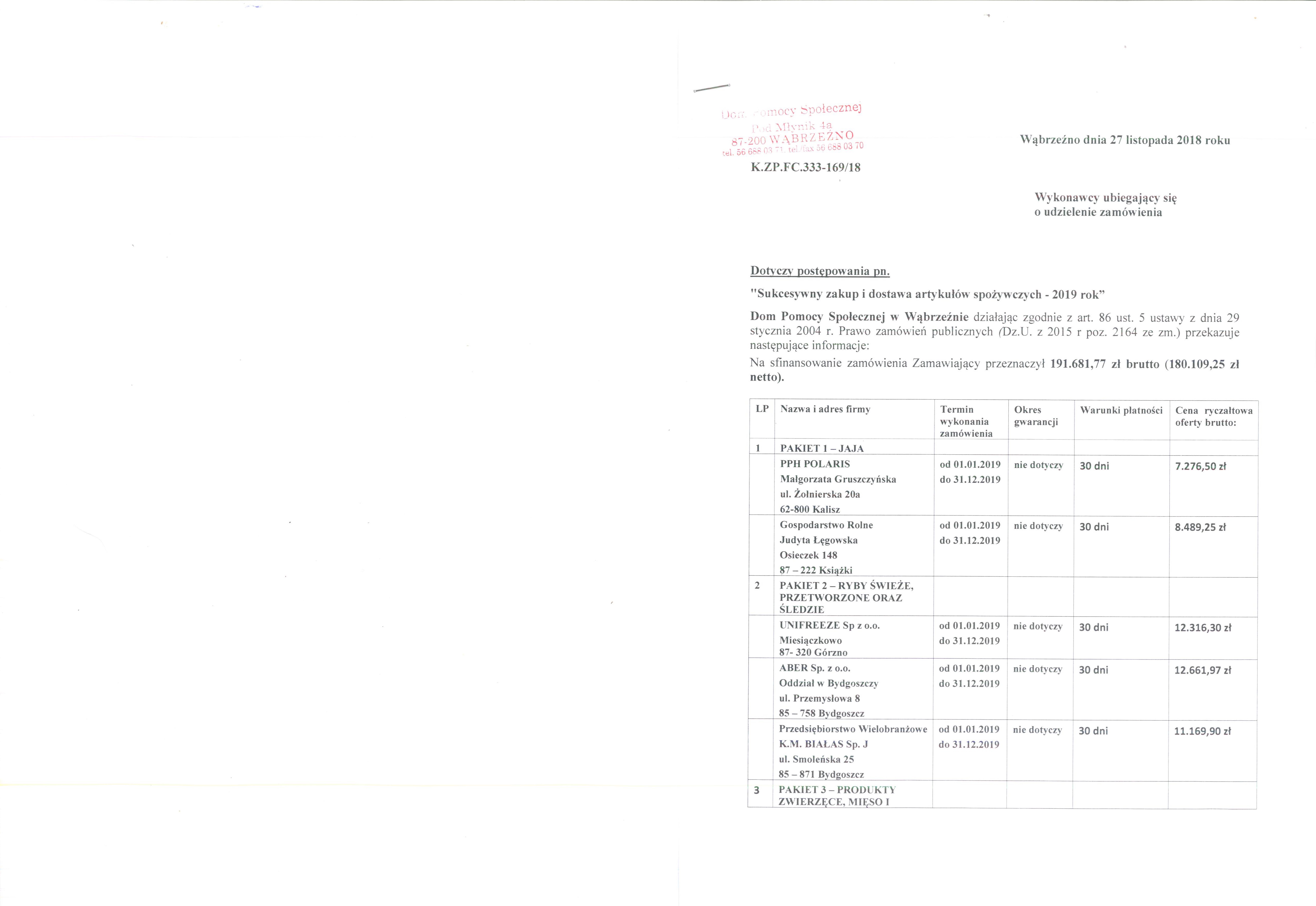 Dom Pomocy Społecznej w Wąbrzeźnie działając zgodnie z art. 86 ust. 5 ustawy z dnia 29 stycznia 2004 r. Prawo zamówień publicznych (Dz.U. z 2015 r poz. 2164 ze zm.) przekazuje następujące informacje: