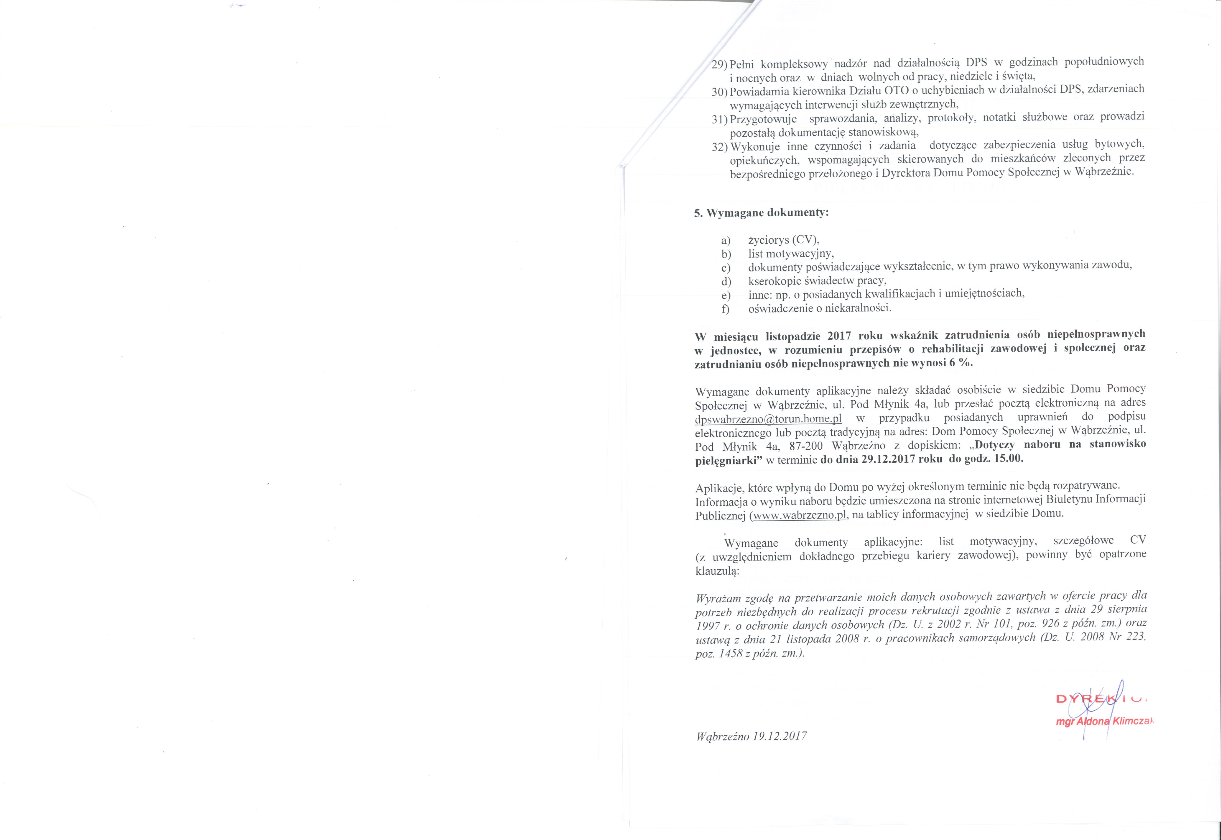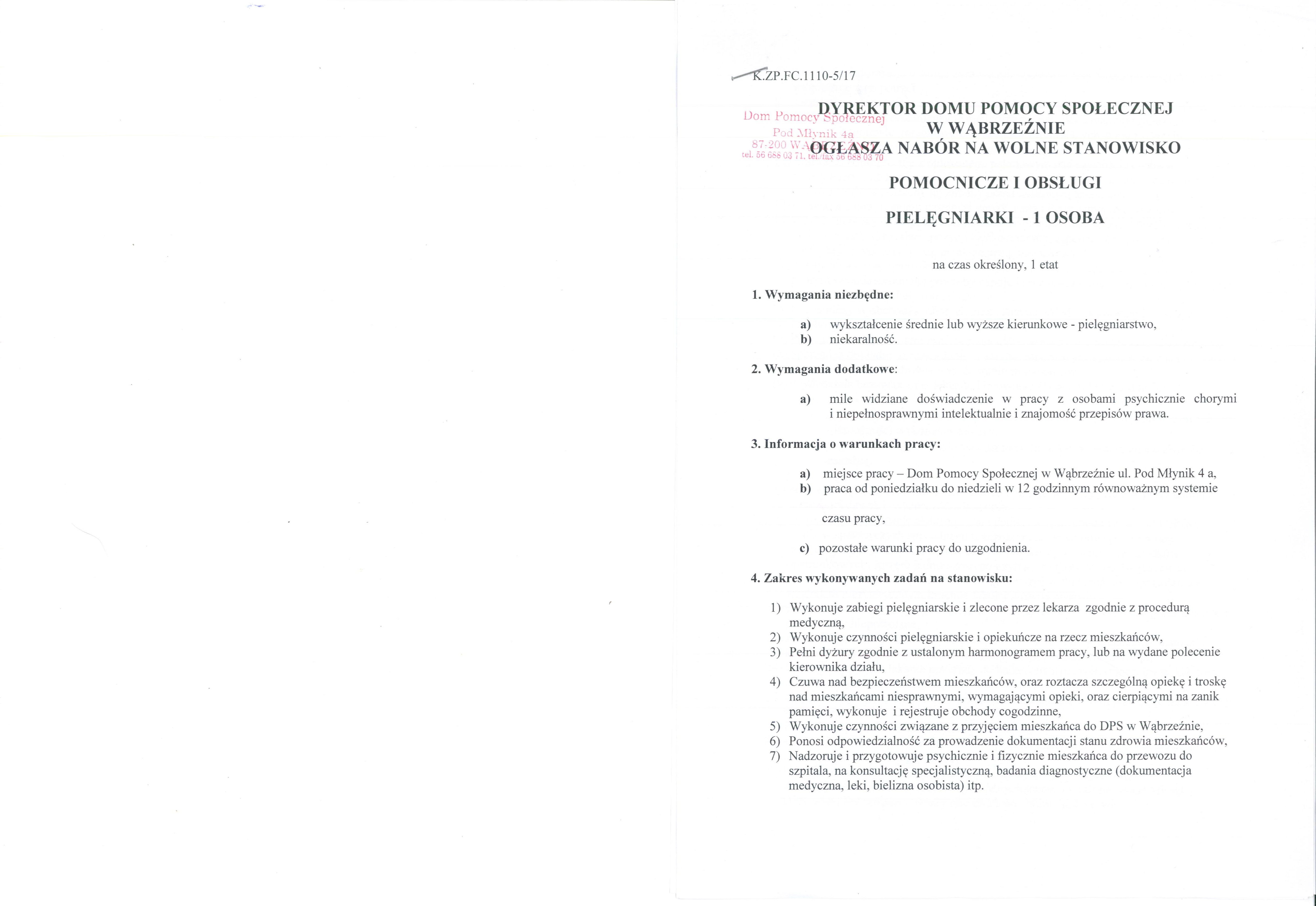 - miejsce pracy – Dom Pomocy Społecznej w Wąbrzeźnie ul. Pod Młynik 4 a,